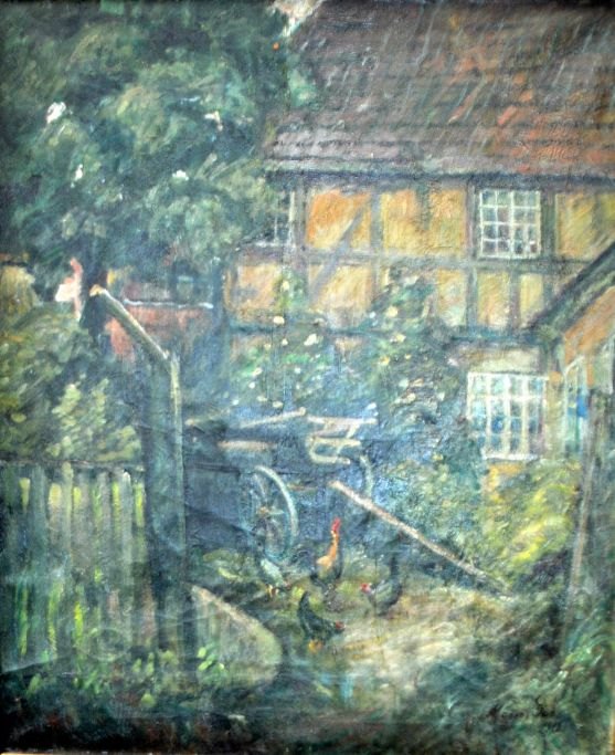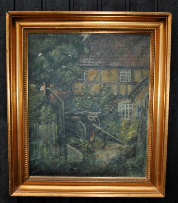 Gad, Mogens (1887 - 1931) Danmark: Høns i en gård. Olie på lærred. Signeret 1919. 55 x 46 cm.