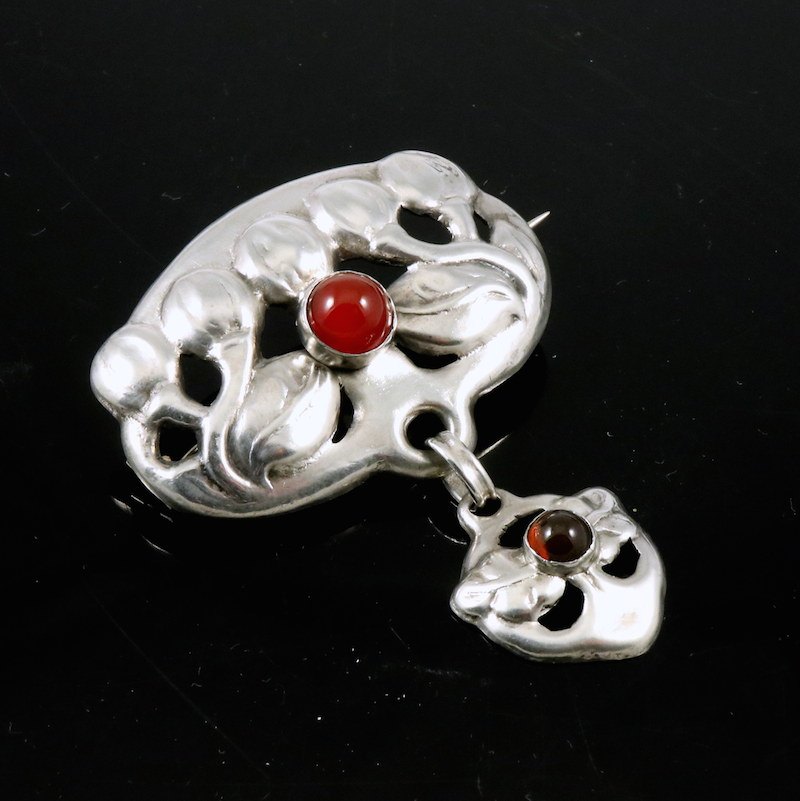 Bernhard Hertz. Art Nouveau Silver Brooch with Carnelian & Garnet
