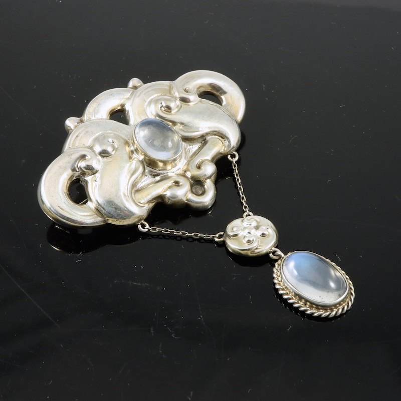 Grann & Laglye. Art Nouveau Silver Brooch with Moonstones.