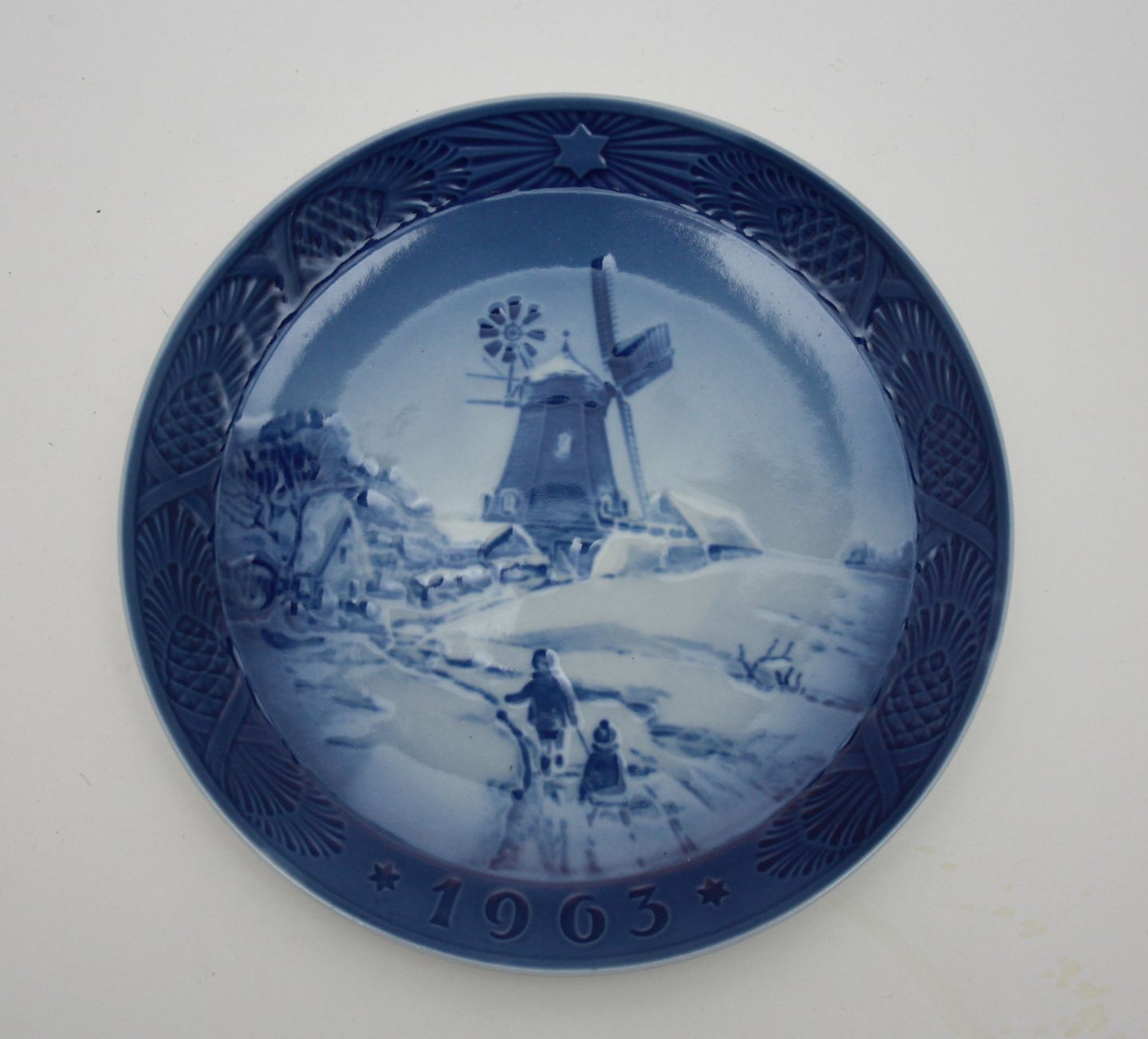 Royal Copenhagen, Juleplatten 1963 "Vindmølle" af Kaj Lange. Diameter 18 cm. 1. sortering. Pris: 250 kr.
