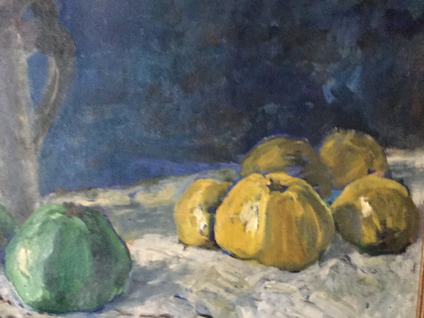 Maleri af Jens Jørgen Jacobsen - Opstilling med tinkrus og frugt.