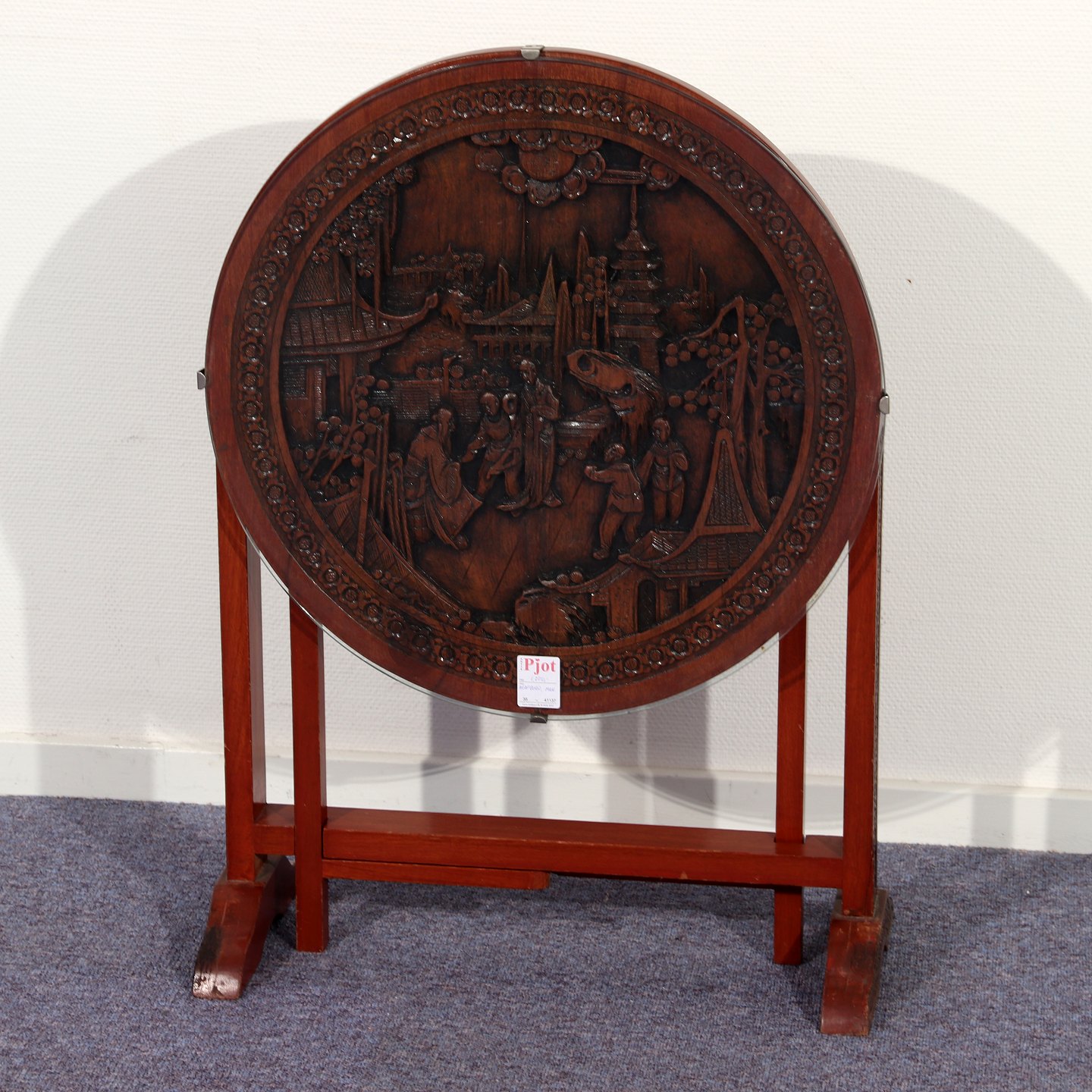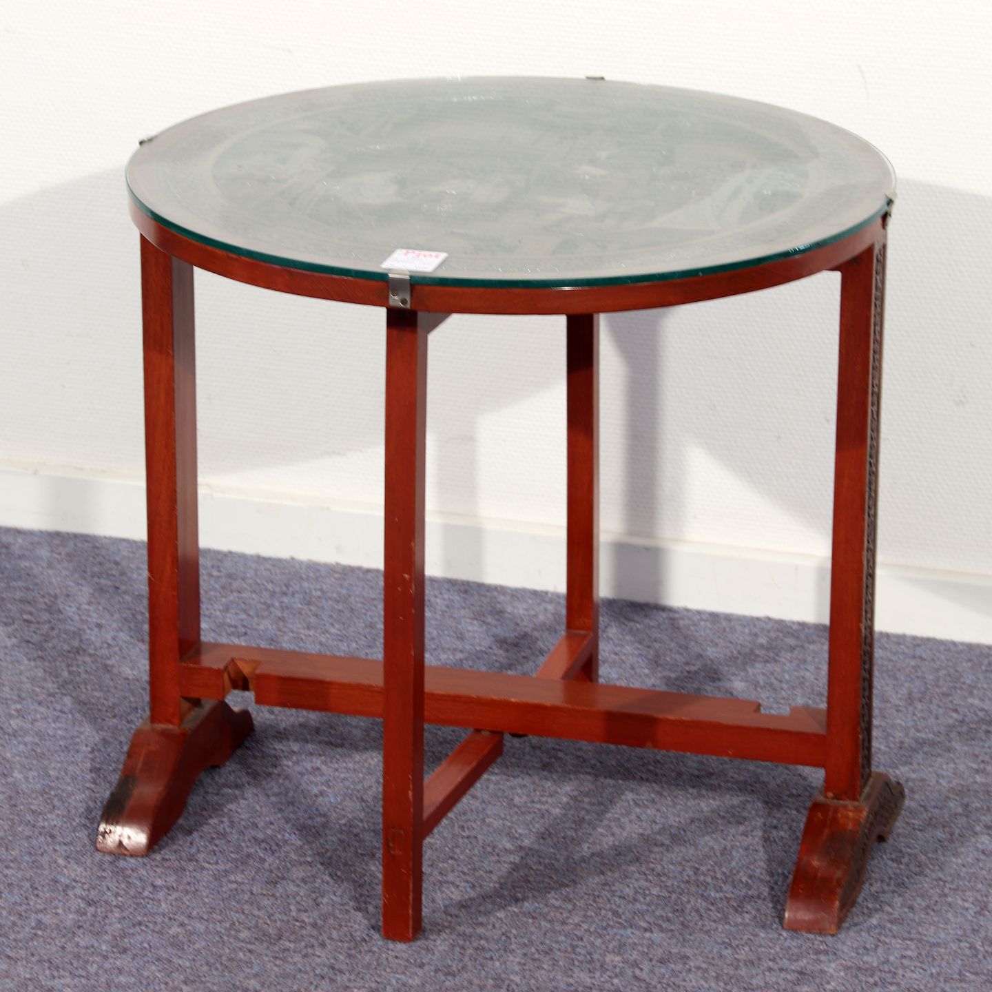Rundt klapbord i mahogni m. rige udskæringer bag glasplade,