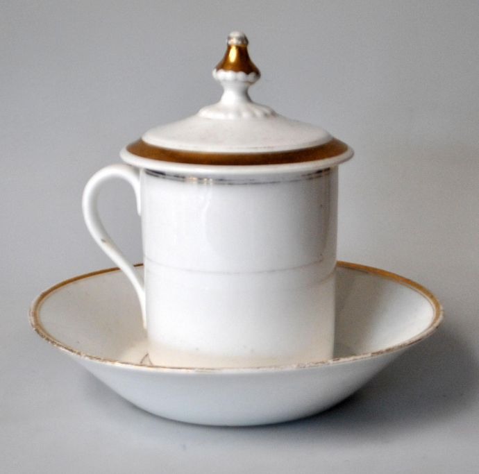 CT Altwasser sygekop med låg, 19. årh. Tyskland. Hvidt porcelæn med forgyldning. Låg med lågknop. Med underkop. Stemplet. H.: 13 cm. Dia. underkop: 16,5 cm.