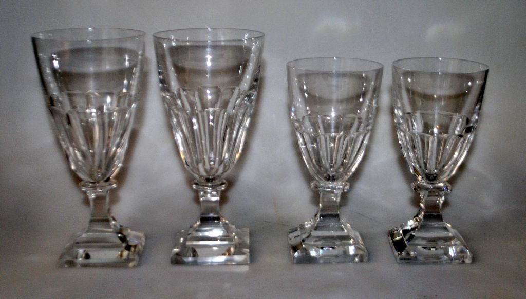 Service i krystal, 20 årh. Kvadratisk fod og kumme med flade slibninger. Muligvis Rusland.