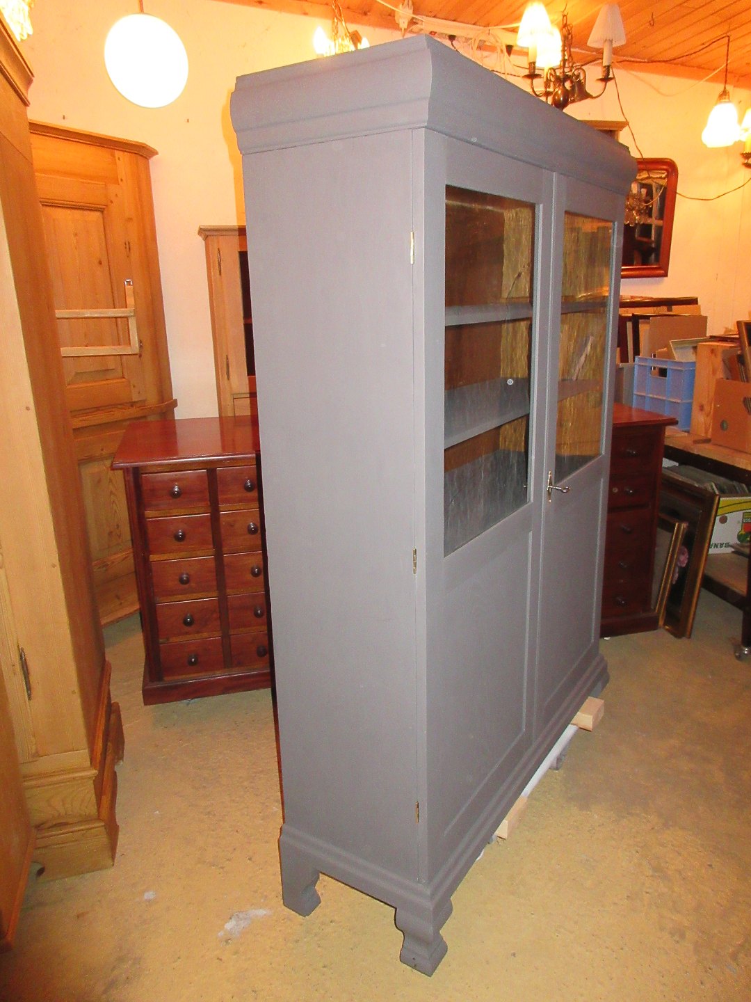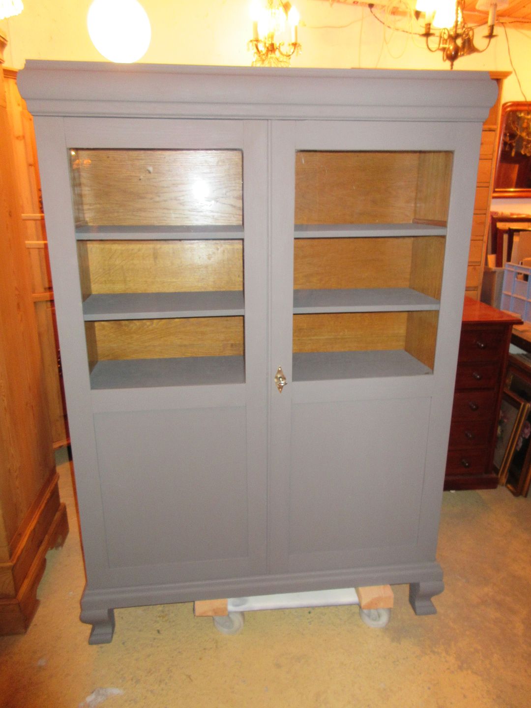 Bogskab med 2 glaslåger og hylder restaureret og malet grå med kalkmaling mål H 157, D 36, B 109,cm. 128/P