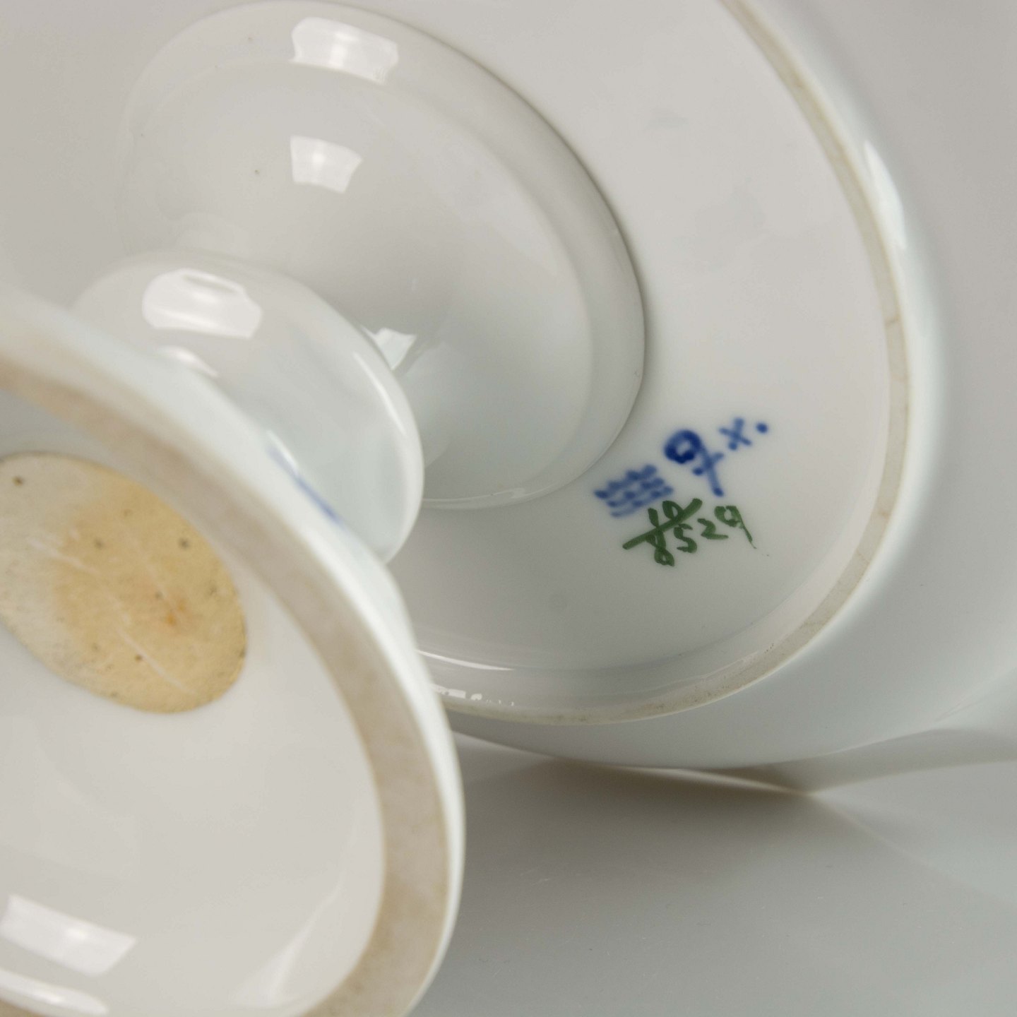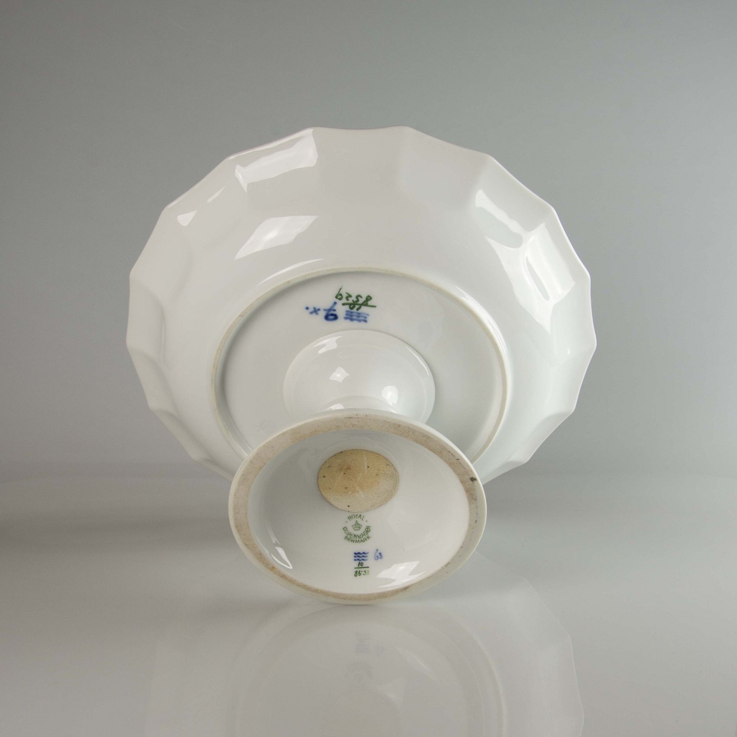 Fad på fod i porcelæn med dekoraktion af blå blomst.