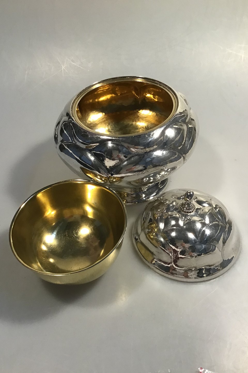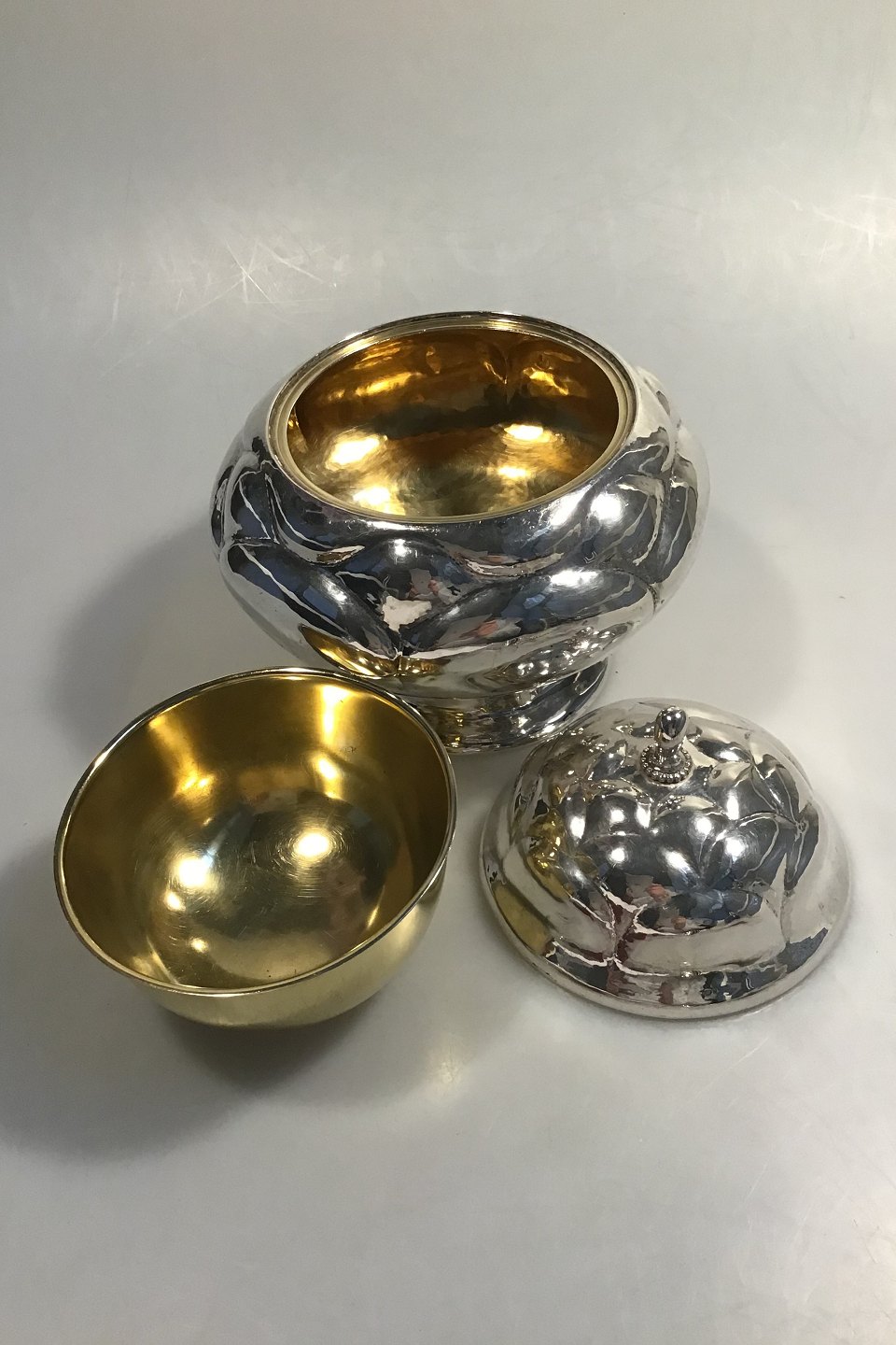 Kaviarlågskål, Sølv, forgyldt inderskål (1919) Måler H 18 Vægt samlet 684 gr Svenske importstempler