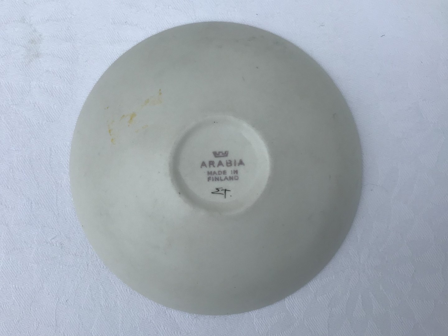 Arabia, Finland, Fennica, Lille skål, 11cm i diameter, 2,5cm høj, Lys blå og rosa farver med emalje prikker, Design Esteri Tomula *Pæn stand*
