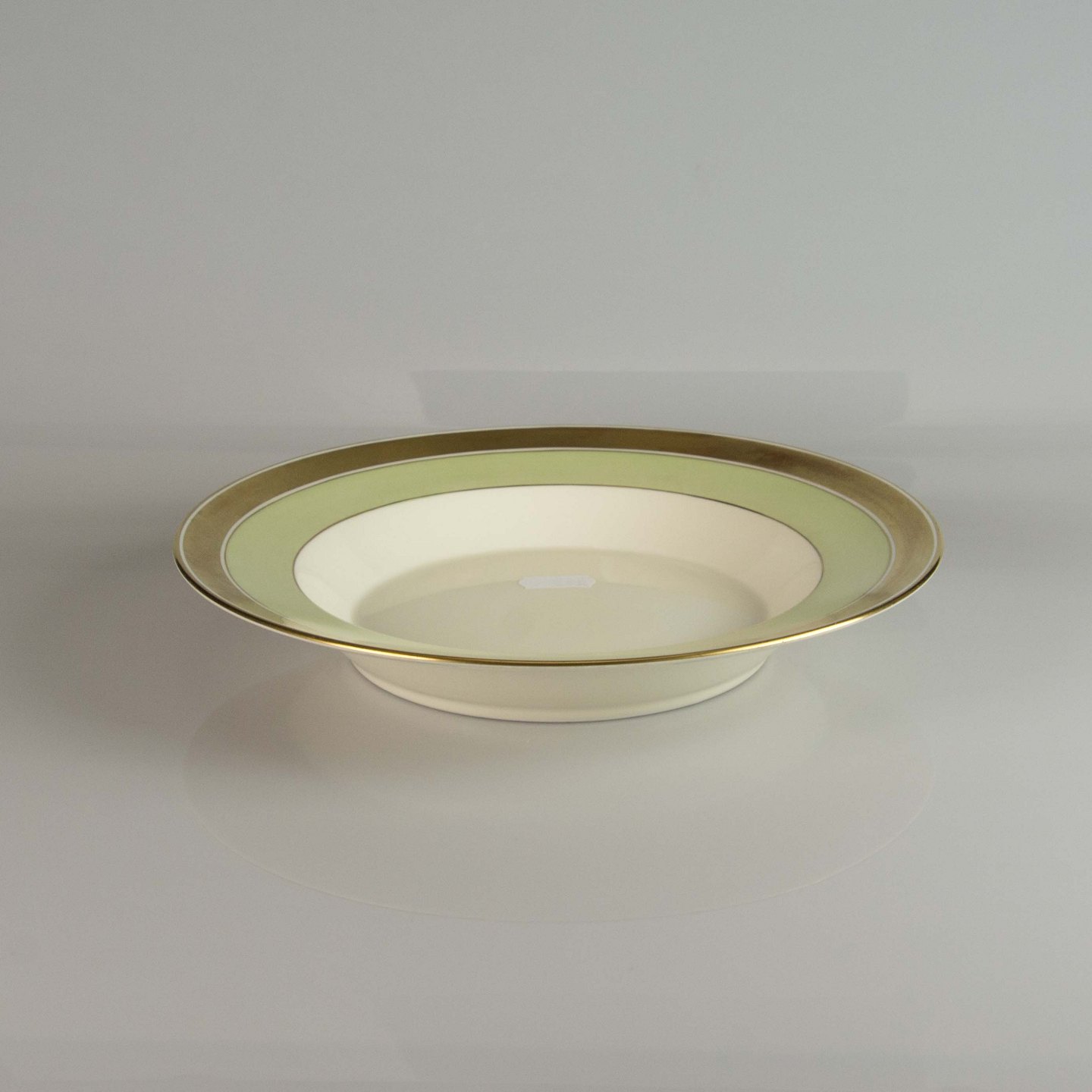 Dyb tallerken i lys grøn og hvid porcelæn med gylden bort med motiv af krone og plantemotiver.