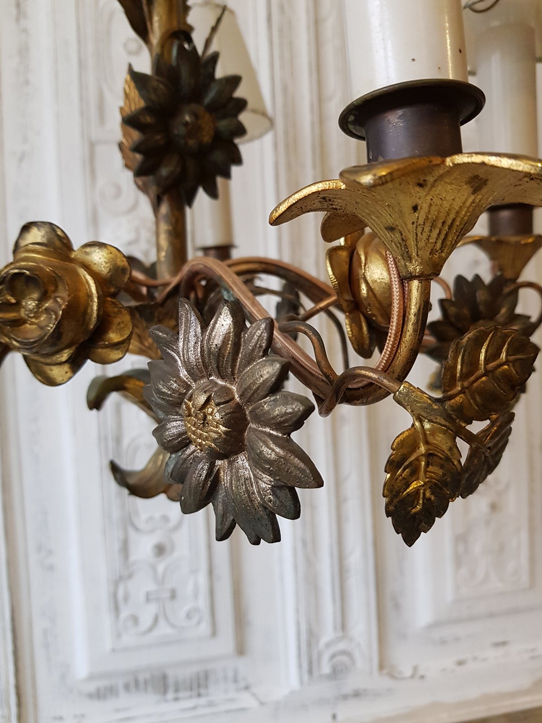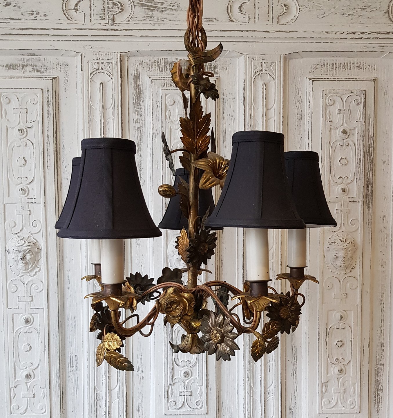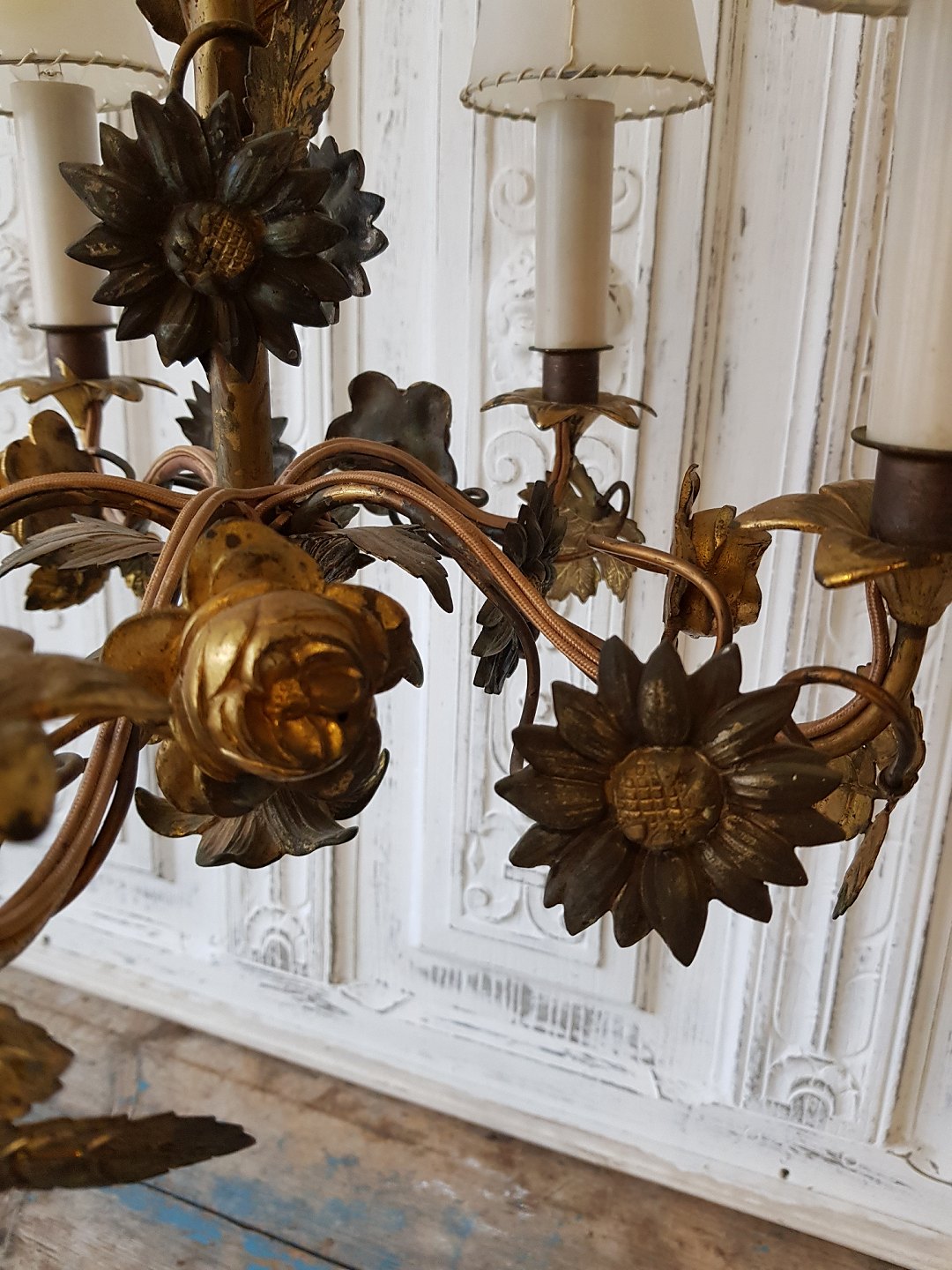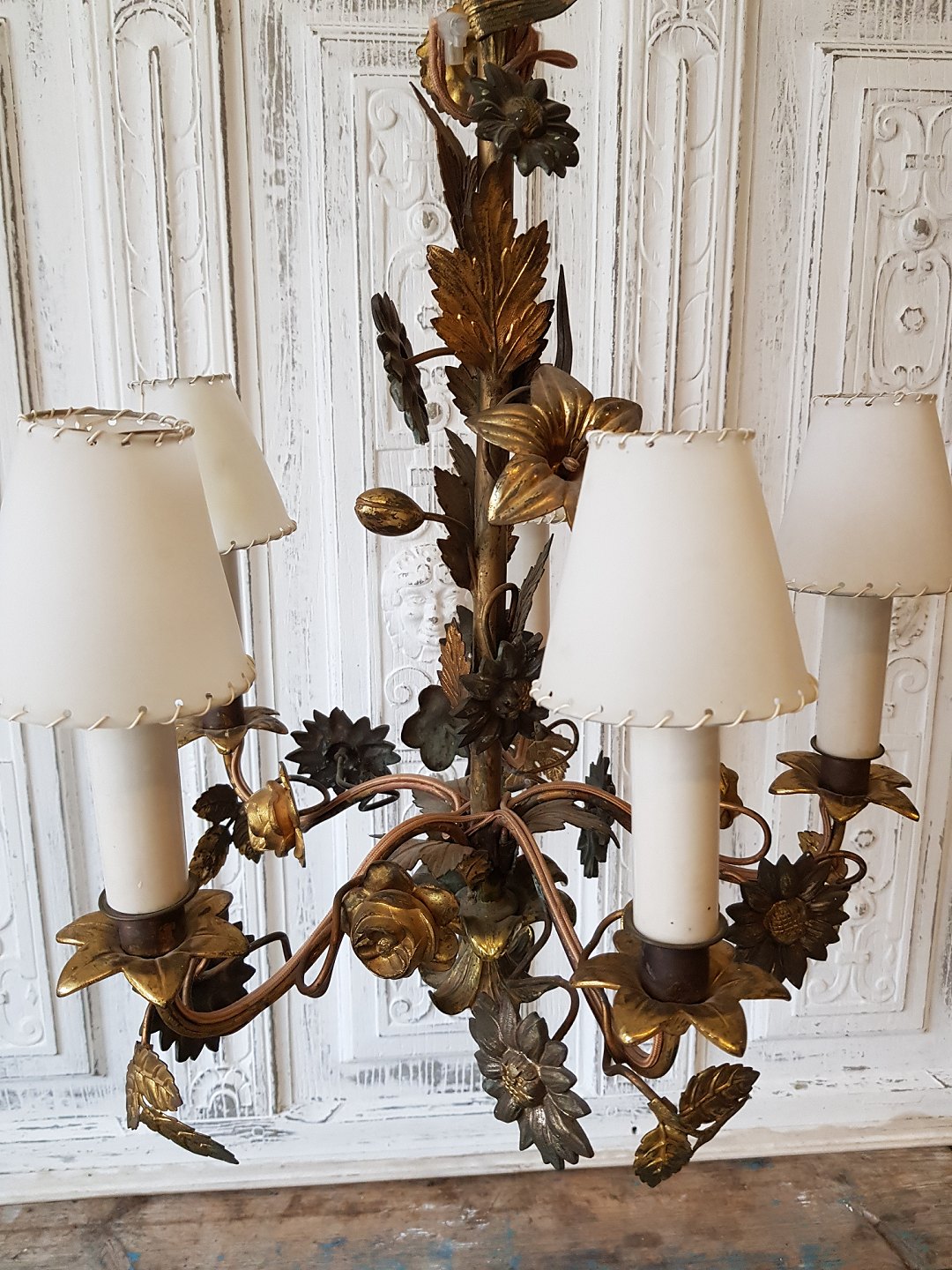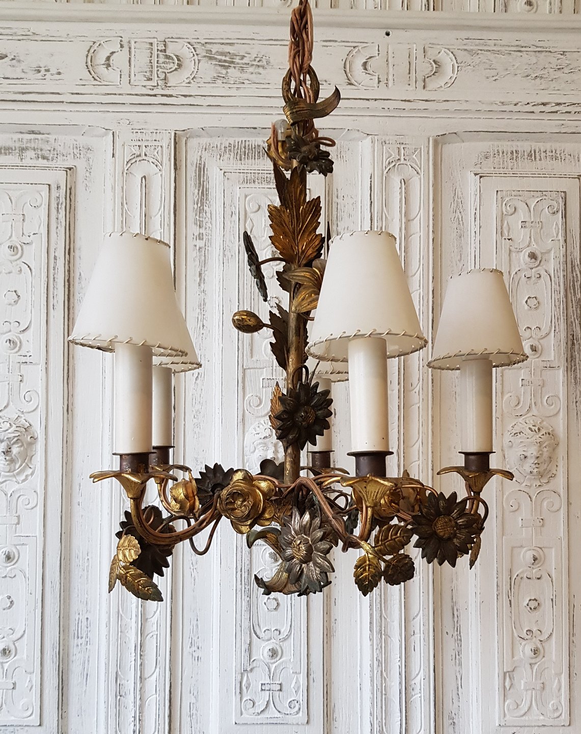 1800tals fransk femarmet lysekrone dekoreret med blomster og blade