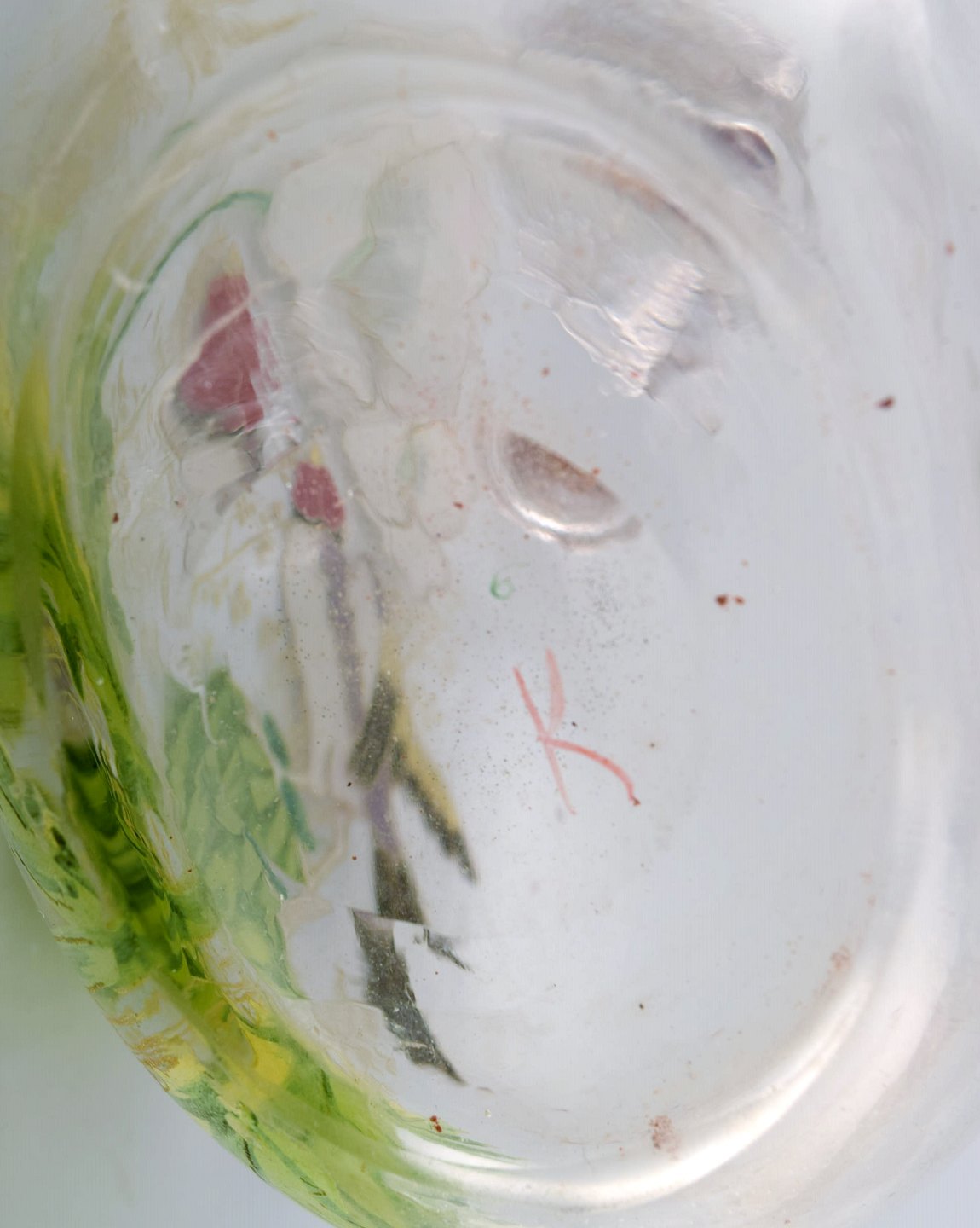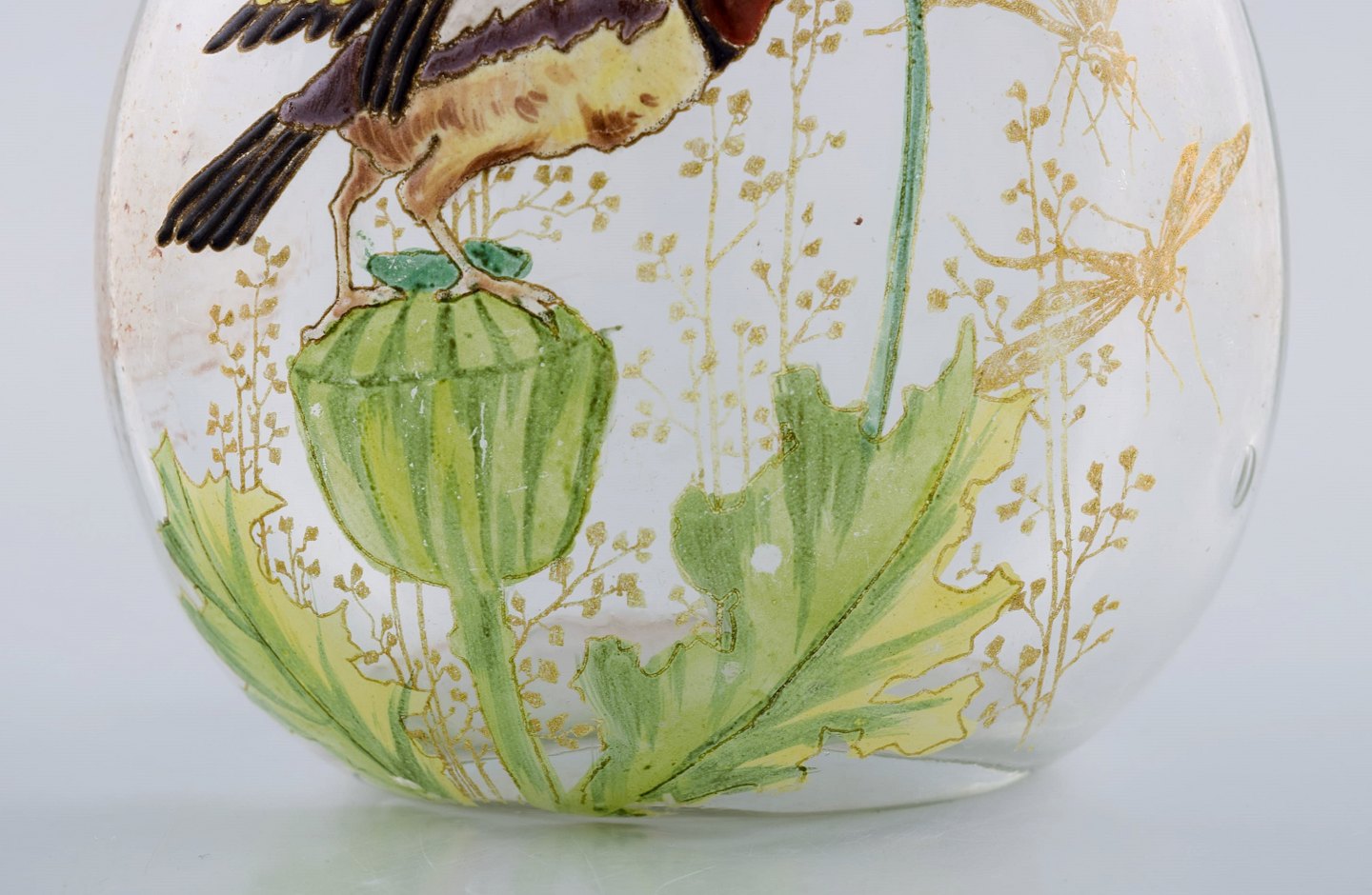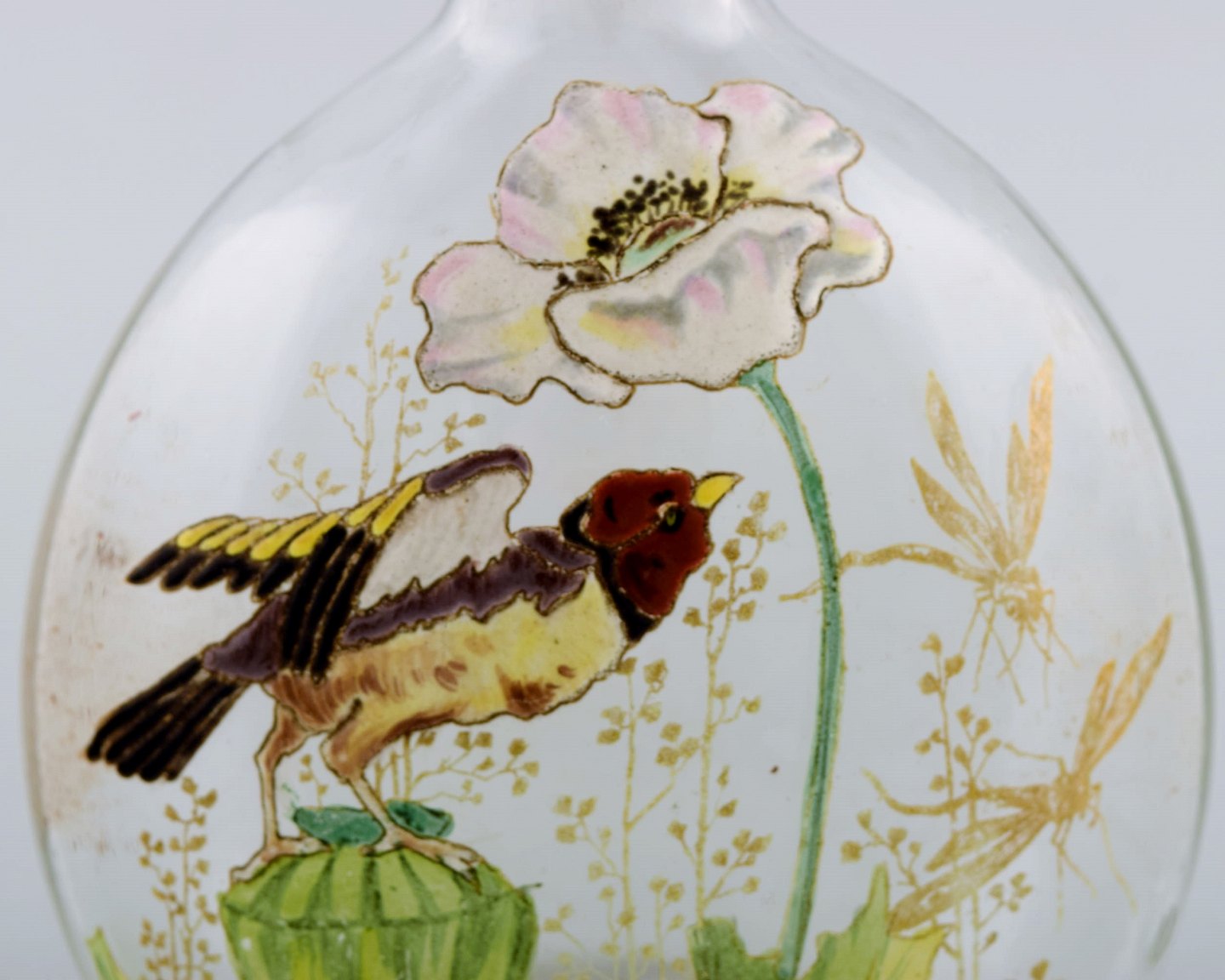 i mundblæst kunstglas. Fugl og blomster. 1890'erne.