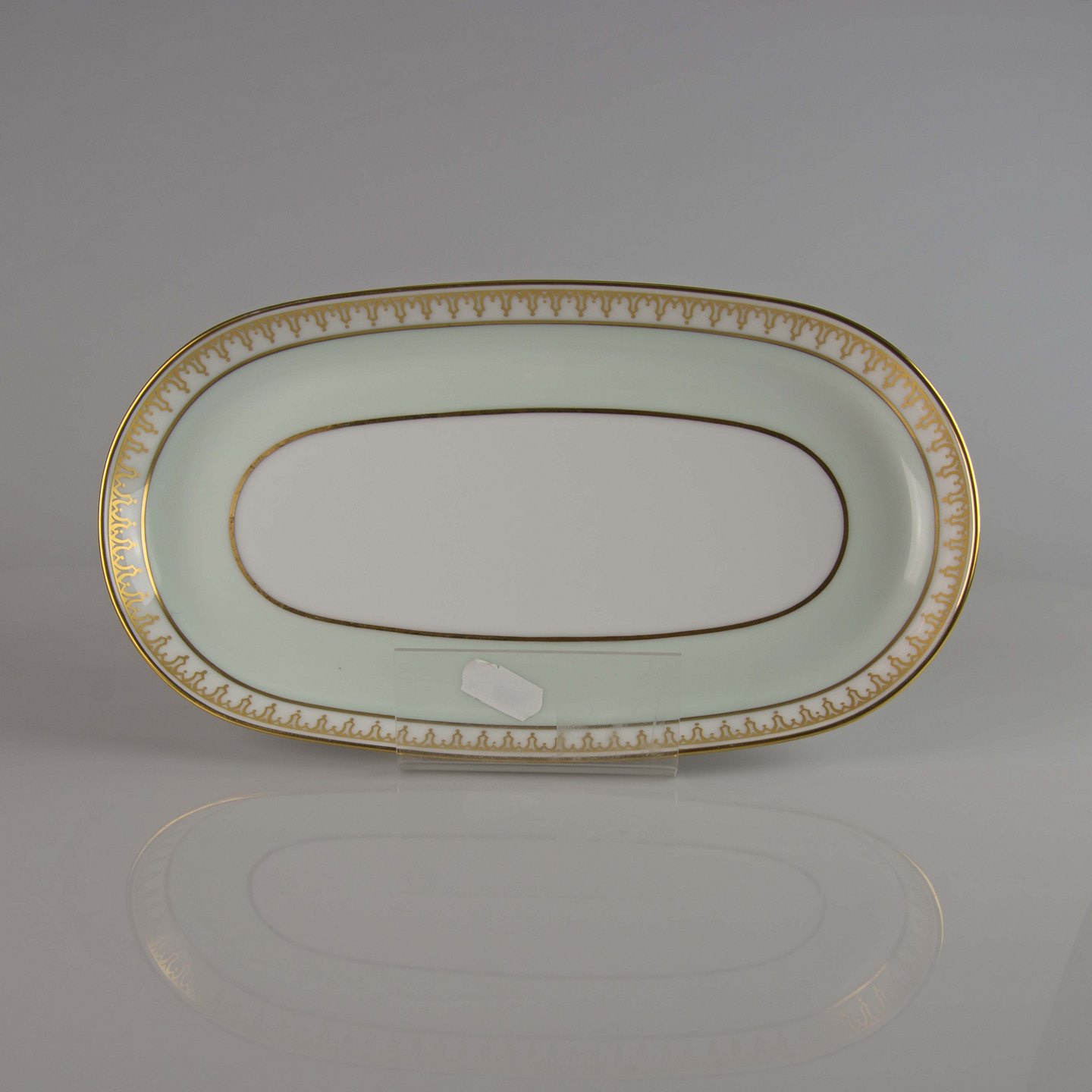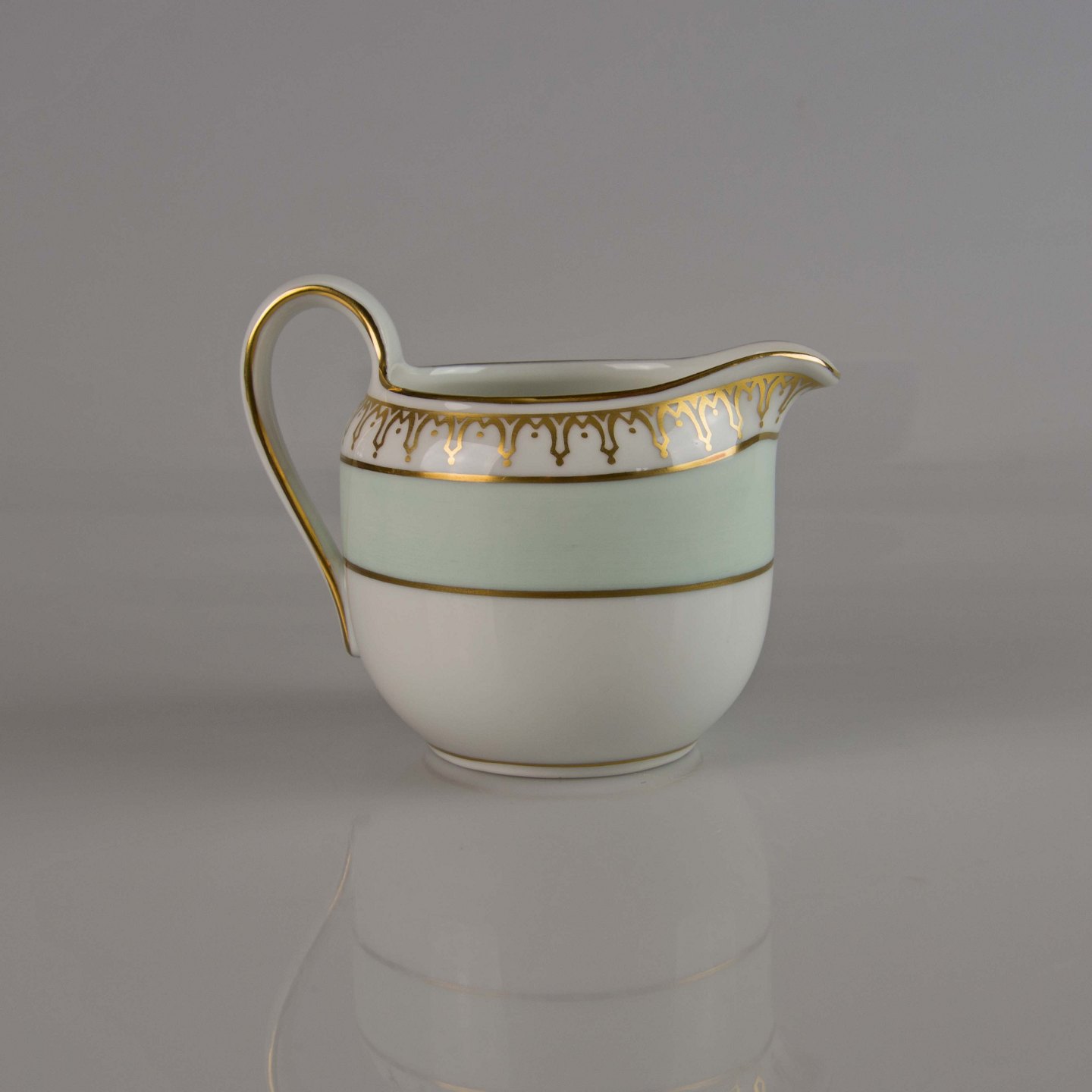 Stel i hvidt porcelæn med lysegrøn kant og gylden dekoration