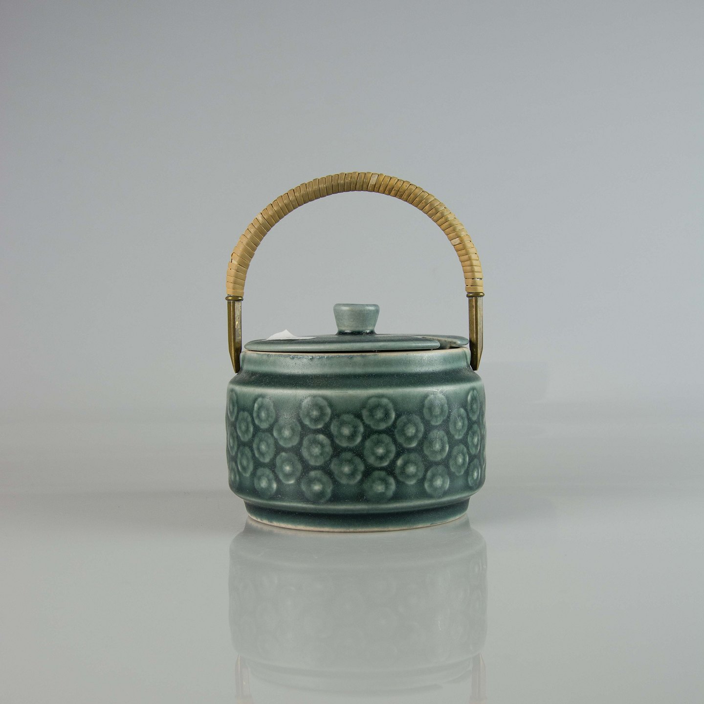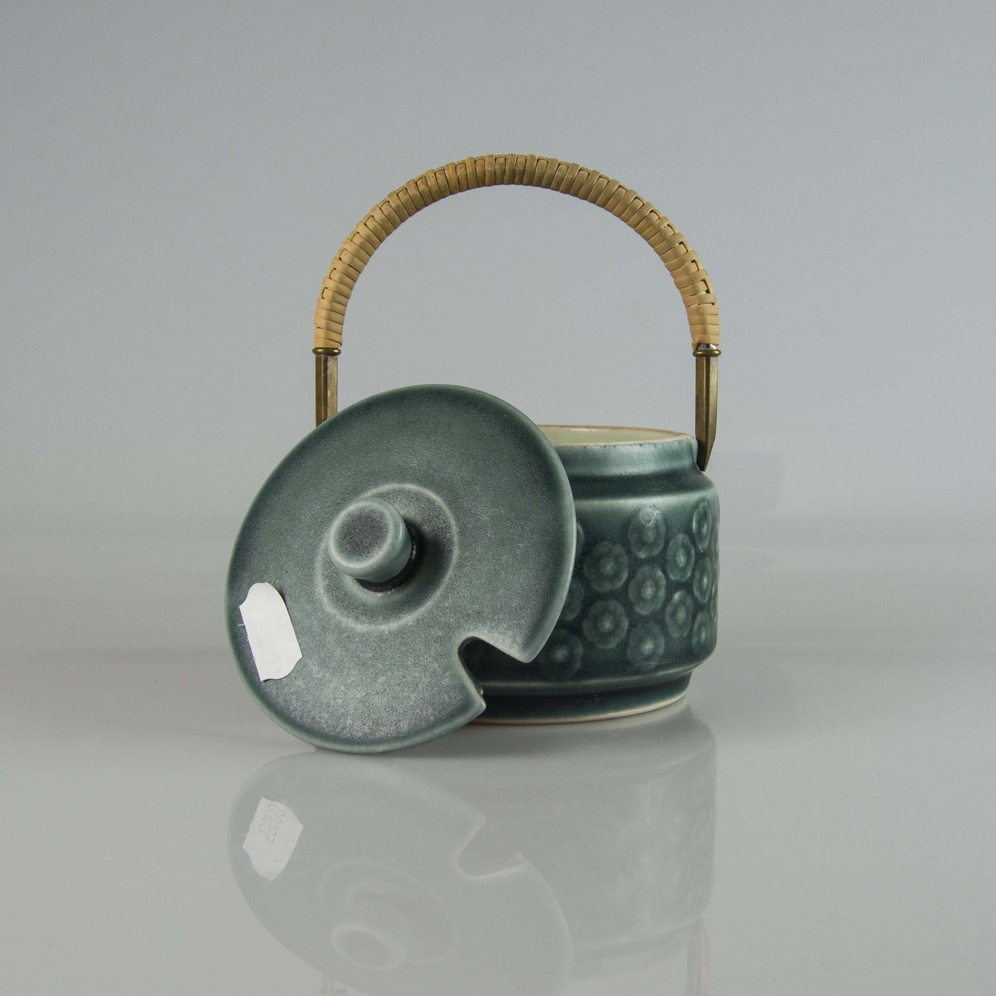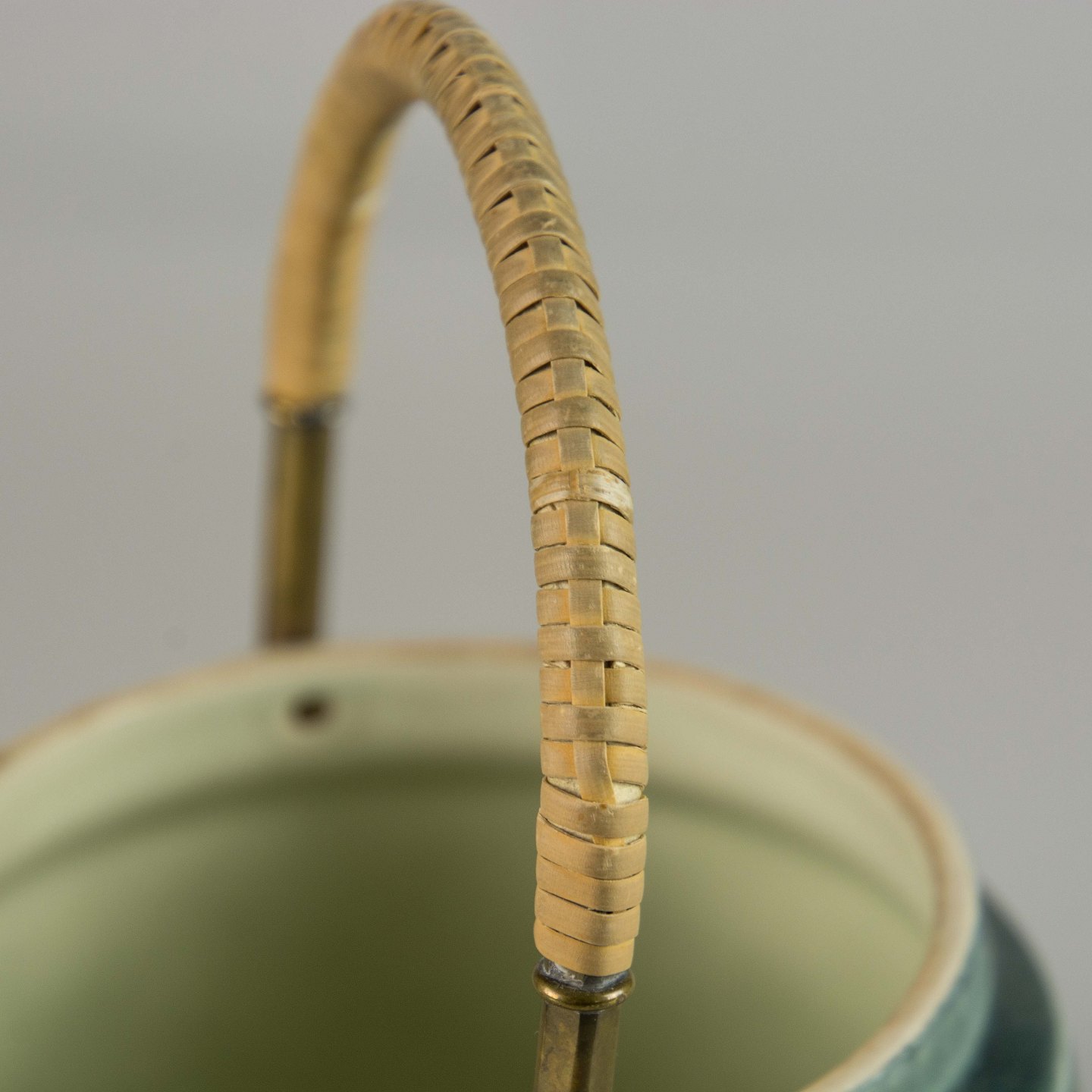 Lågkrukke i blågrøn stentøj med blomster motiver og håndtag i messing beklædt med bambusflet.