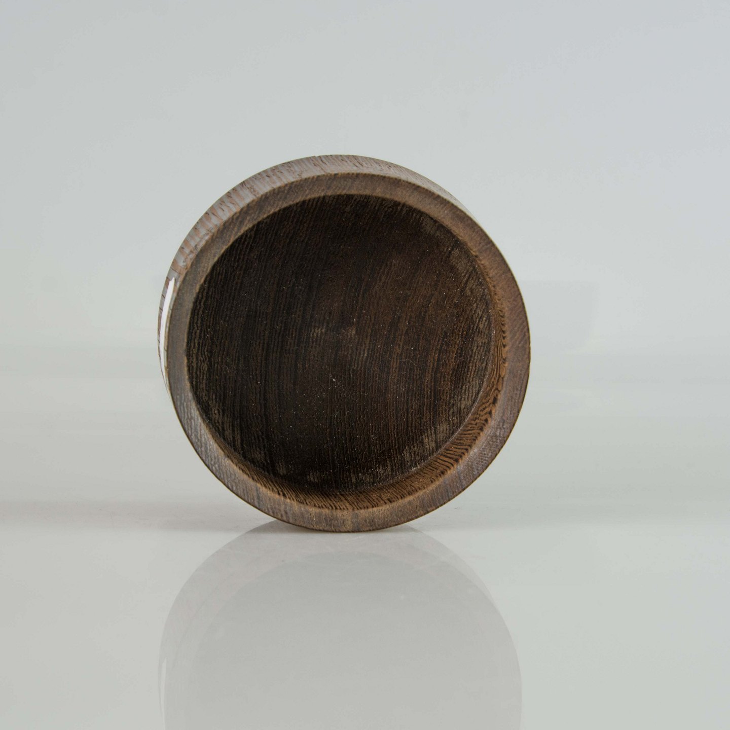 Sæt i gulligt stentøj med motiv af blade og tagtøj samt bundskål i træ