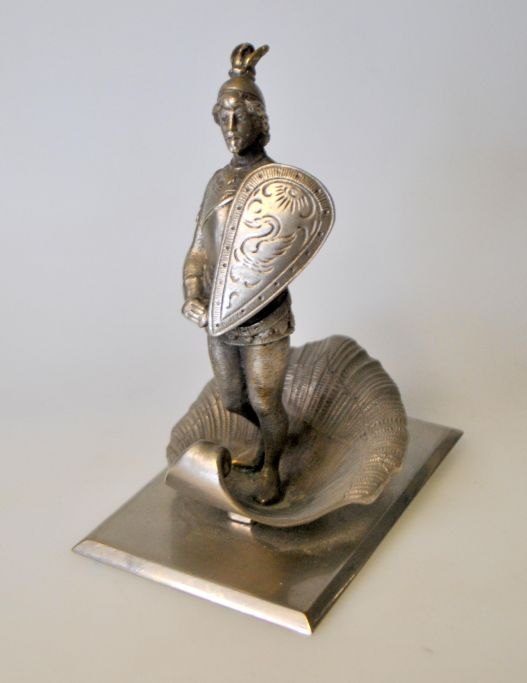 Antique letter weight, 19th century. A man with a shield in a clam shell. Metal. H ,; 14 cm.