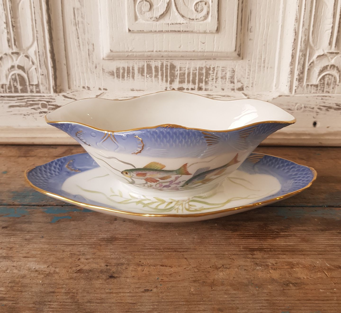 Royal Copenhagen Fiskestel med guld saucekande dekoreret med fisk og tang.