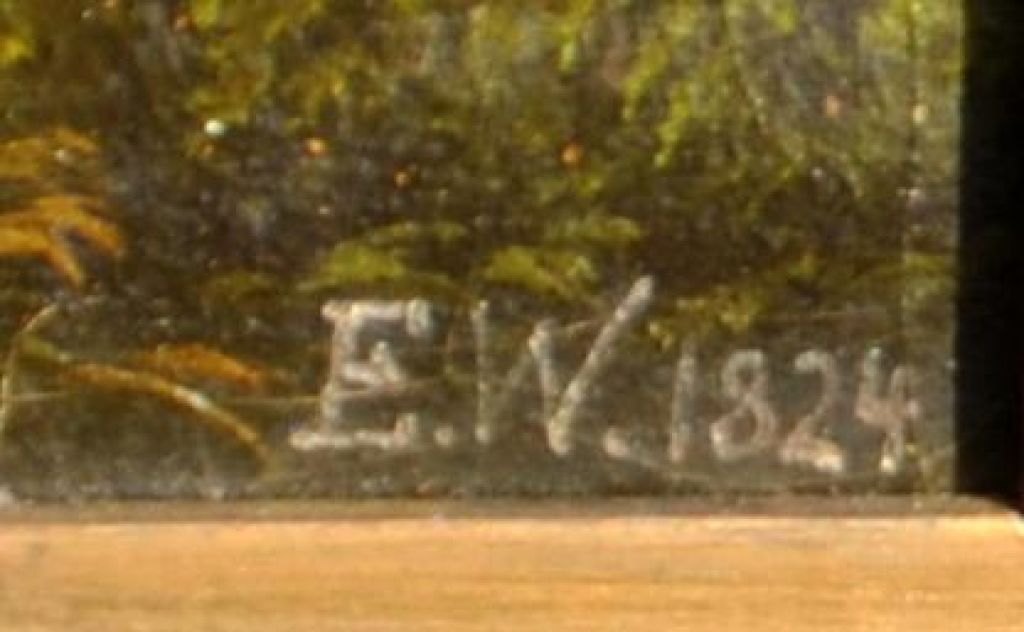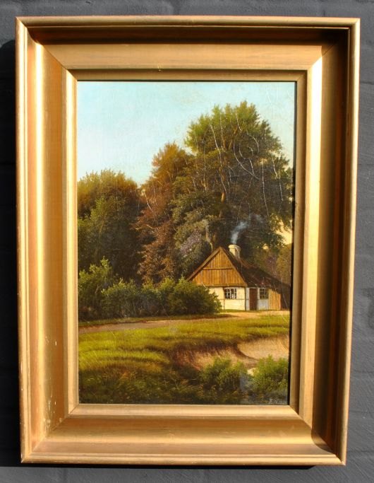 Wolff, Aage Jacob Emil (ca. 1807 - 1830) Danmark: Et hus i skovkanten. Olie på lærred/plade. Signeret. 53 x 38 cm.