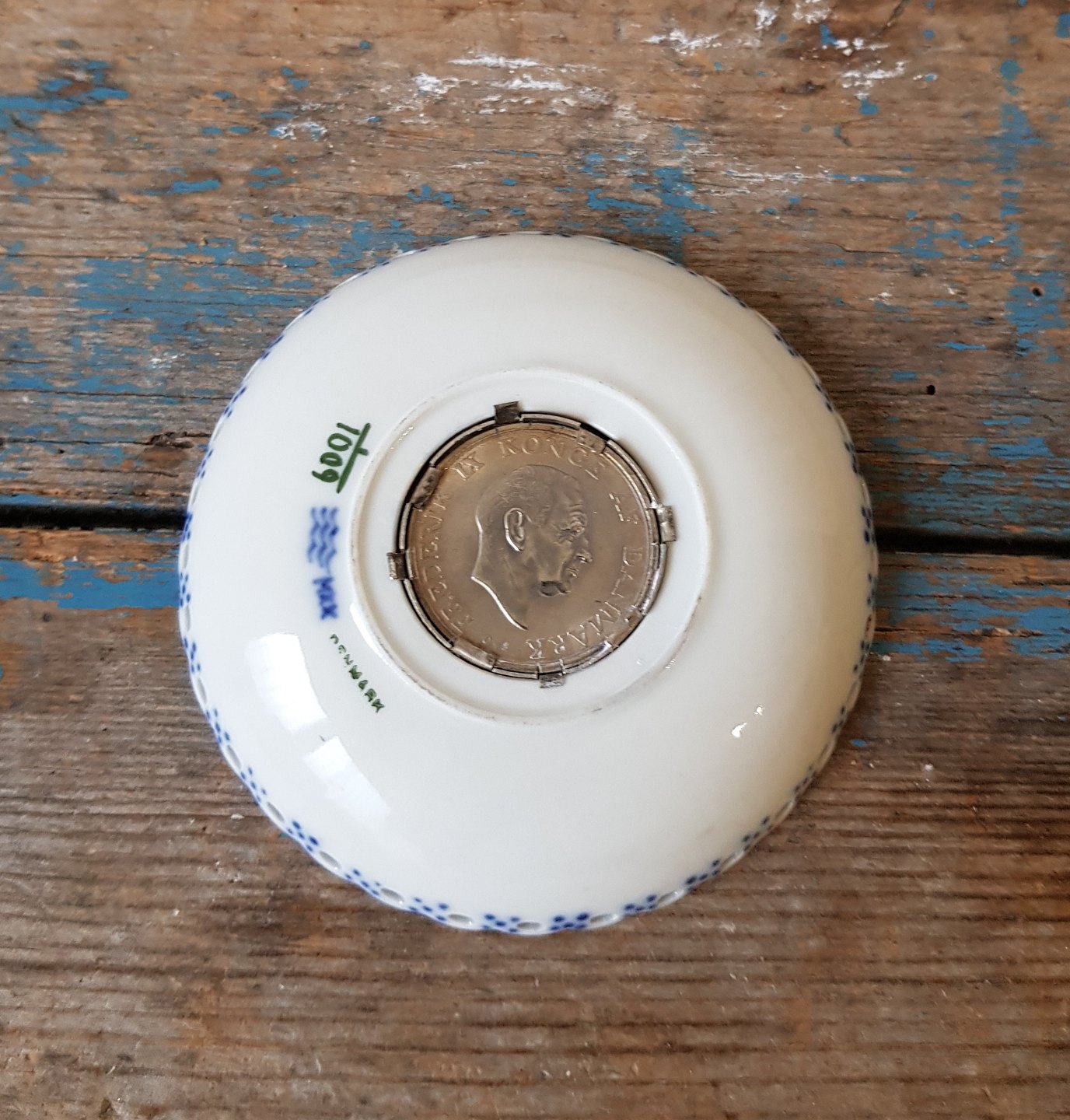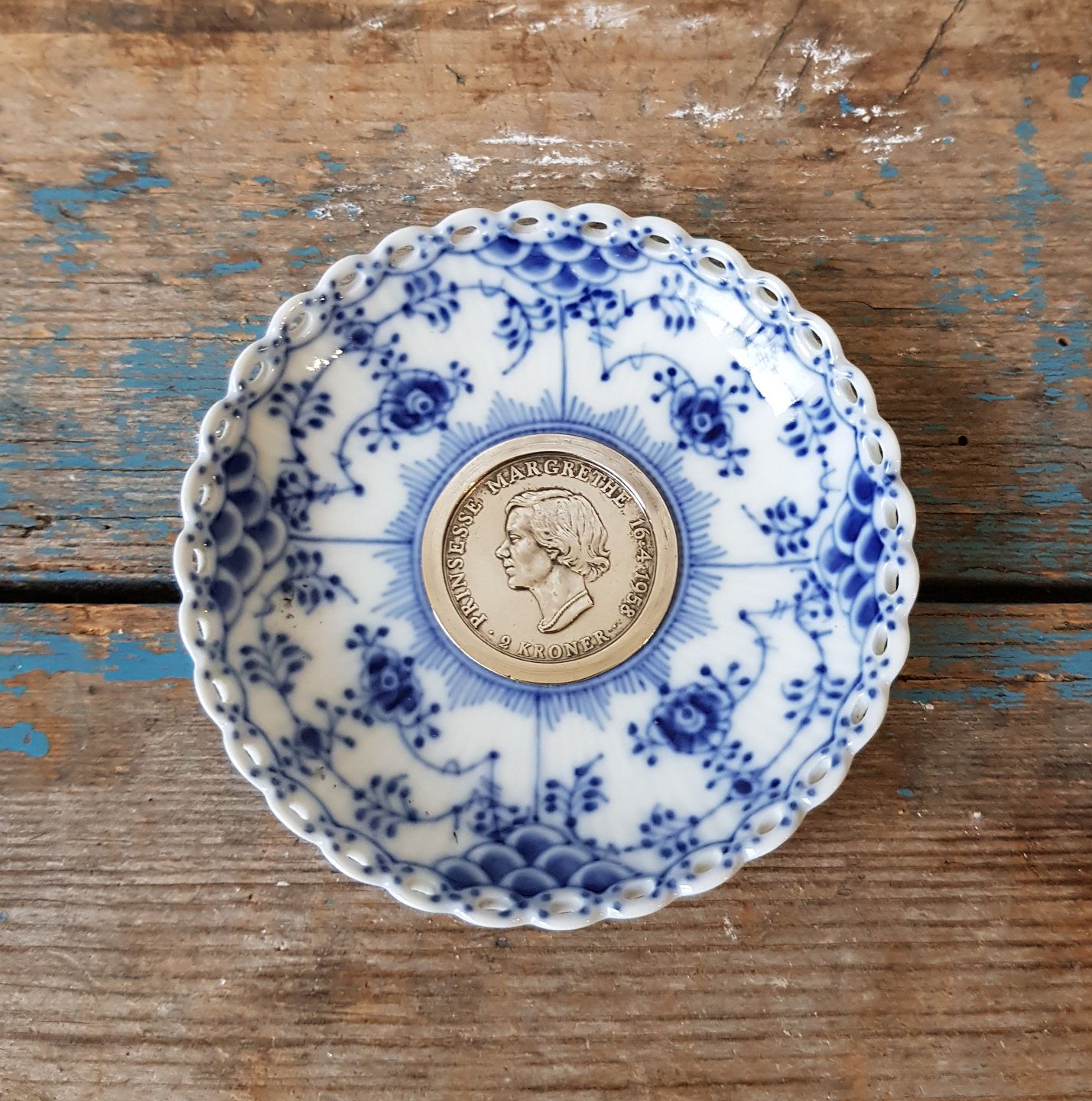 Royal Copenhagen Musselmalet helblonde manchet med sølv mønt - Prinsesse Margrethe 18 års fødselsdag 16. April 1958.