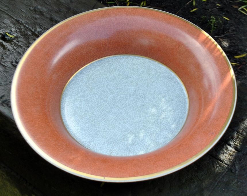 Royal Copenhagen, stort fad, 212/3508, craquelle, 20. årh., København, Danmark. Grålig skærv med lysrødt overglasrur og forgyldning. Dia.: 29,5 cm.