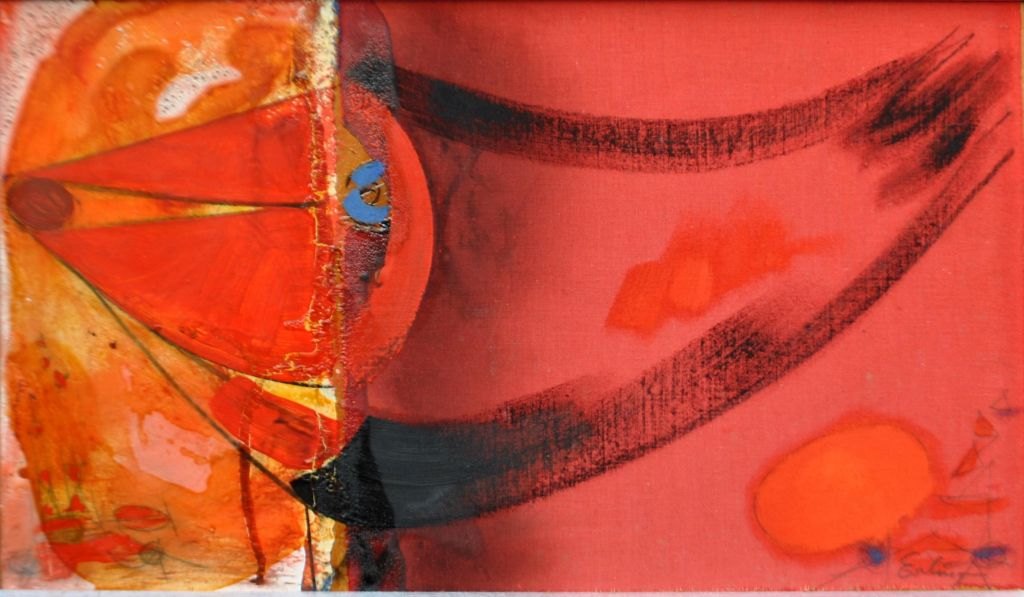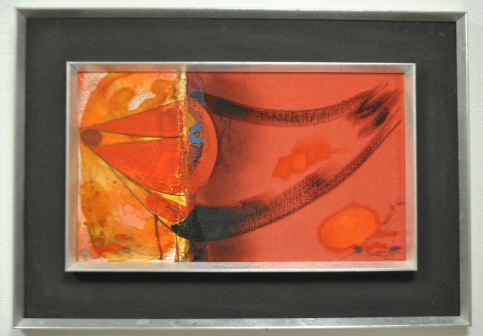 Andersen, Erling (1937 - 2010) Danmark: Komposition. Mixed media på stof. Signeret. 35 x 61 cm.  Indrammet.