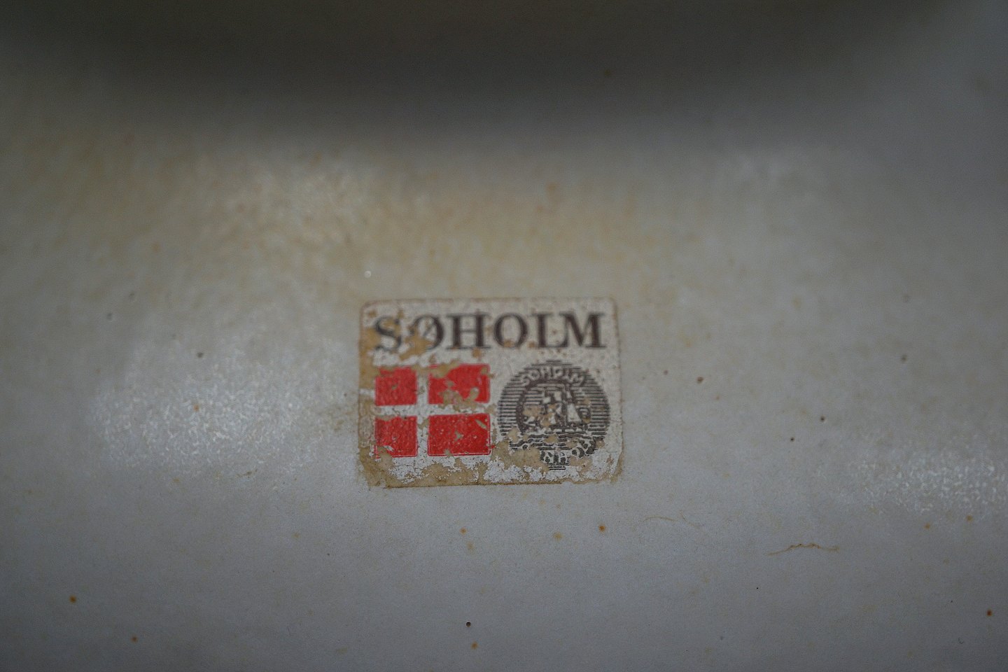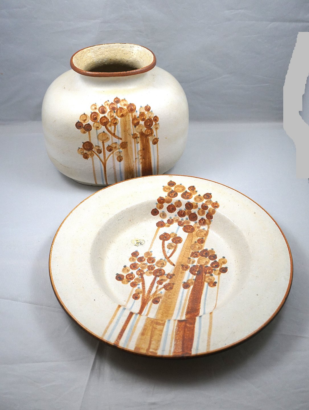 Text available in Danish: Søholm Keramik. Vase nr. 3771, fad nr. 3770. Vasen er oval, begge dele er cremefarvet og dekoreret med lysebrune blomster. Delene er signeret E.P.