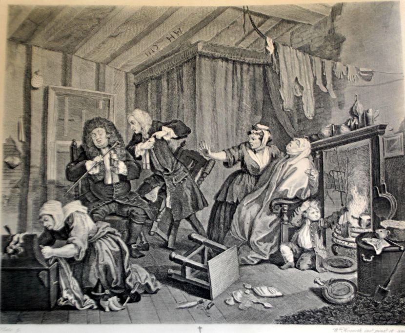 Hogart, William (1697 - 1764) England: Interiør scene med personer. Plate 5. Signeret. 32,5 x 39,5 cm.