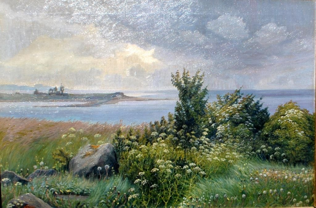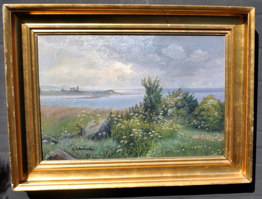 Matthiessen, Hjalmer (1880 - 1957) Denmark: Motif from Horsens fjord. Motif from Snaptur towards Hjarnø. White screen plants. Oil on canvas. Signed monogram 1909. 49.5 x 74 cm.