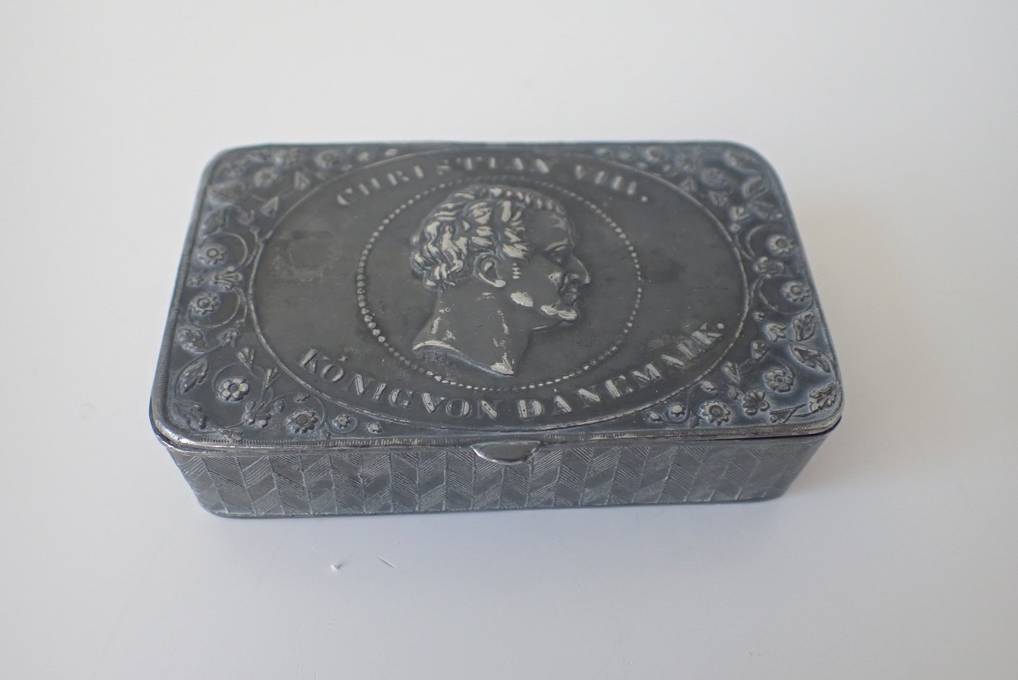 Til vense æske med profil af kong Christian VIII (1786 - 1848 - konge fra 1839 til 1848). Tekst: "Christian VIII. Kònig Von Danemark". Omkredsende blomsterdekoration på låg samt stiliseret vinkeldekoration på sider og bund. 1800 - tallets første halvdel. Mål: 7 x 4 x 1,8 cm. Solgt.