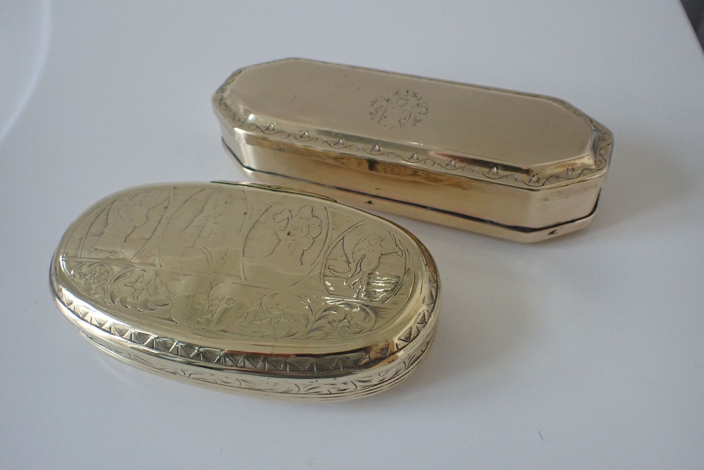 Text available in Danish: 2 tobaksdåser i messing. I pæn stand med tidstypisk slid.