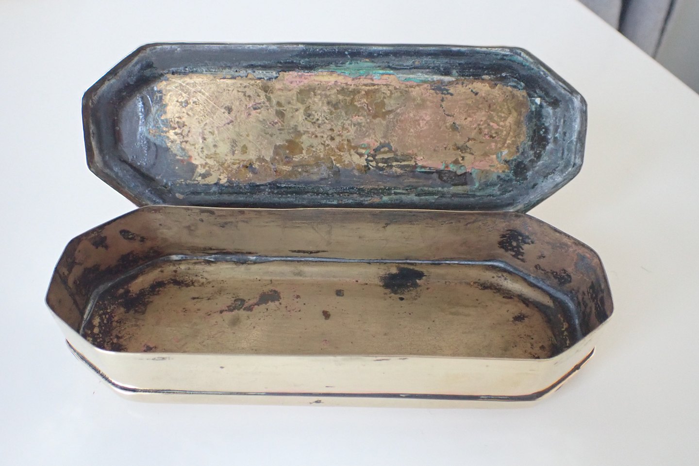 Bagerst: Kantet dåse med våbenskjold med springende hest. Tysk eller engelsk ca. 1890. Højde: 3 cm. Længde: 14,5 cm. Bredde: 5 cm. Pris: 400 kr.