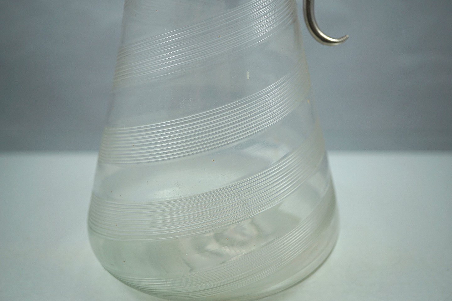 Glaskande med pletsølv hældetud og hank. Ingen stempler. Kanden er dekoreret med en spiral, fra øverst til nederst