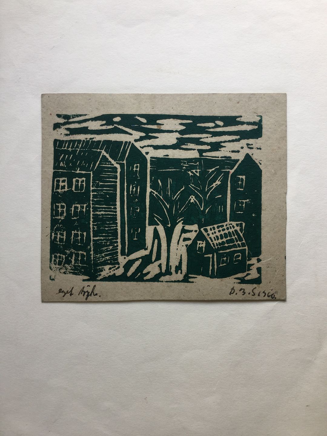 Linoleumssnit af Peder Brøndum Sørensen - Højhuse 1960.