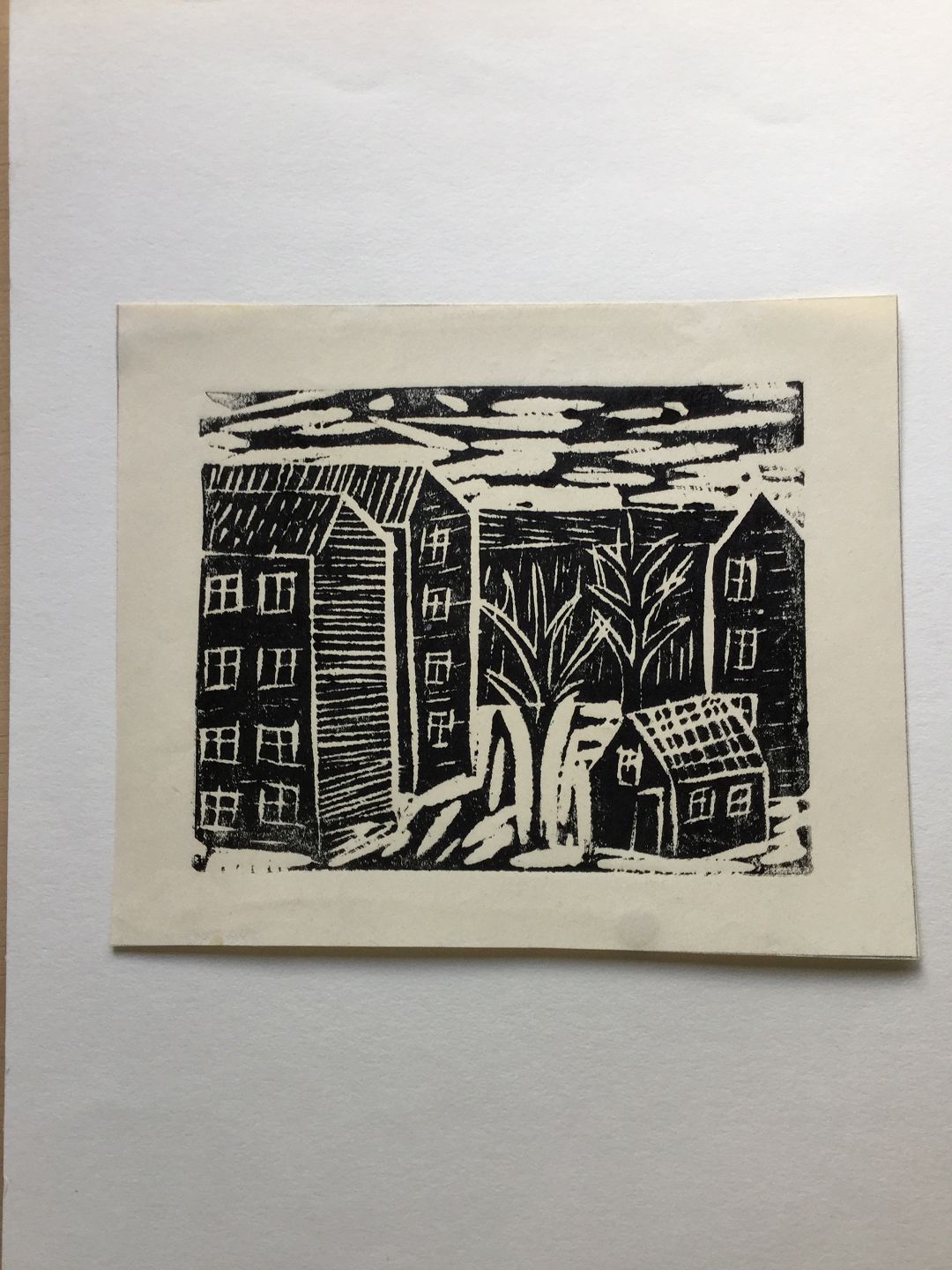 Linoleumssnit af Peder Brøndum Sørensen - Højhuse 1960.