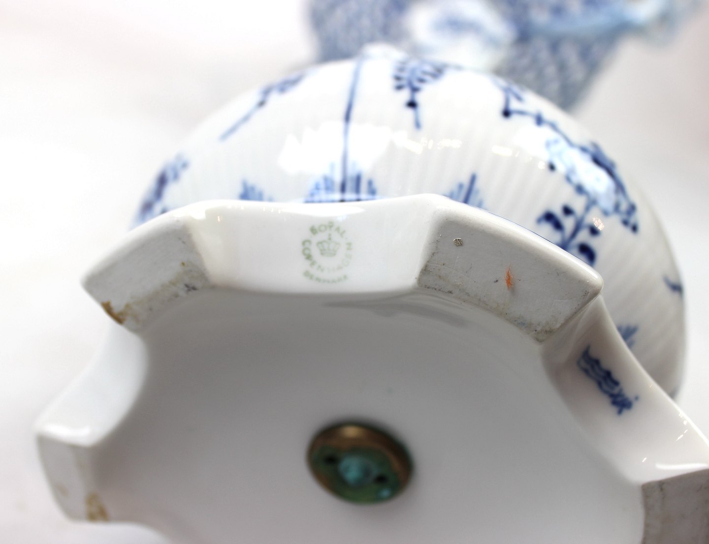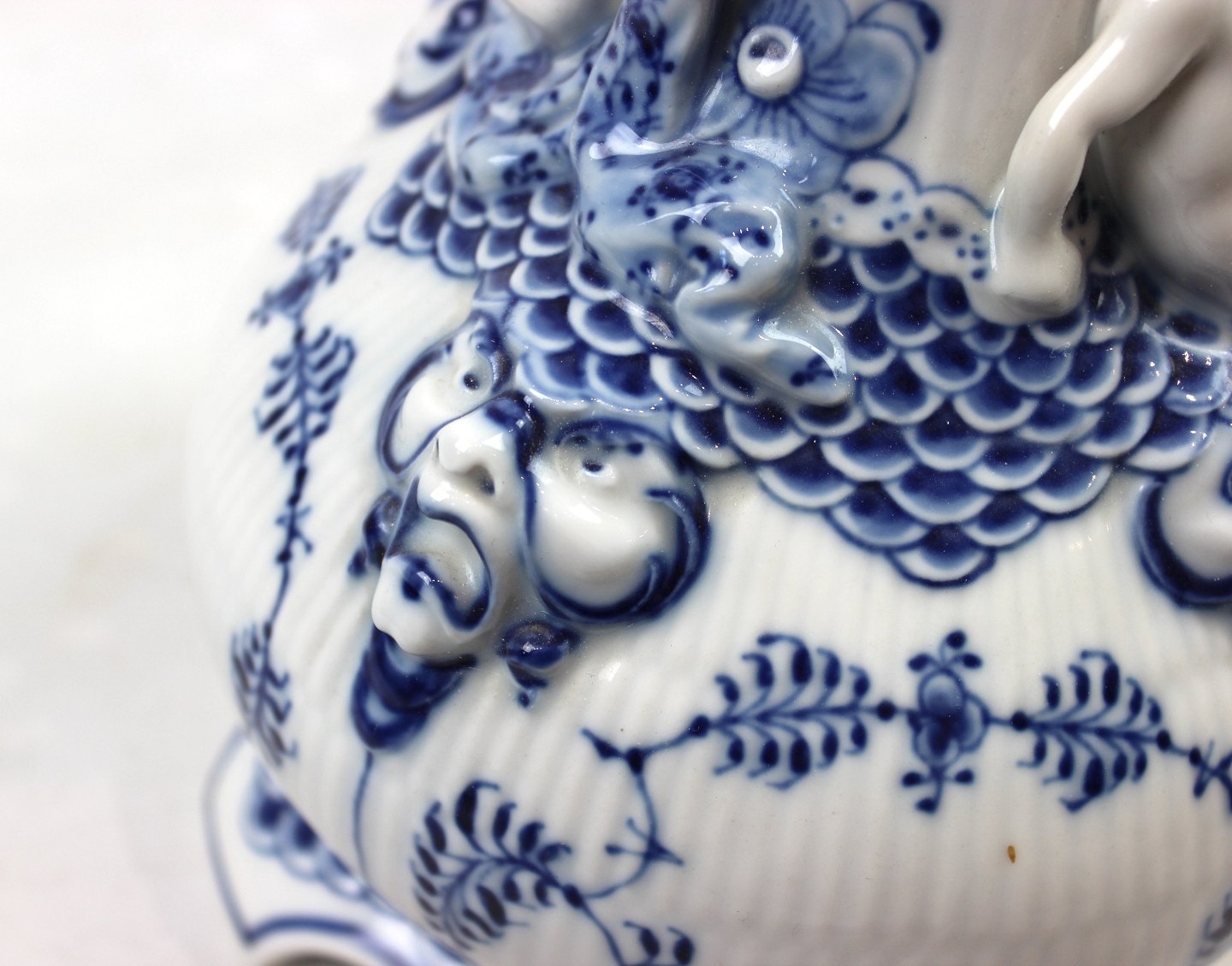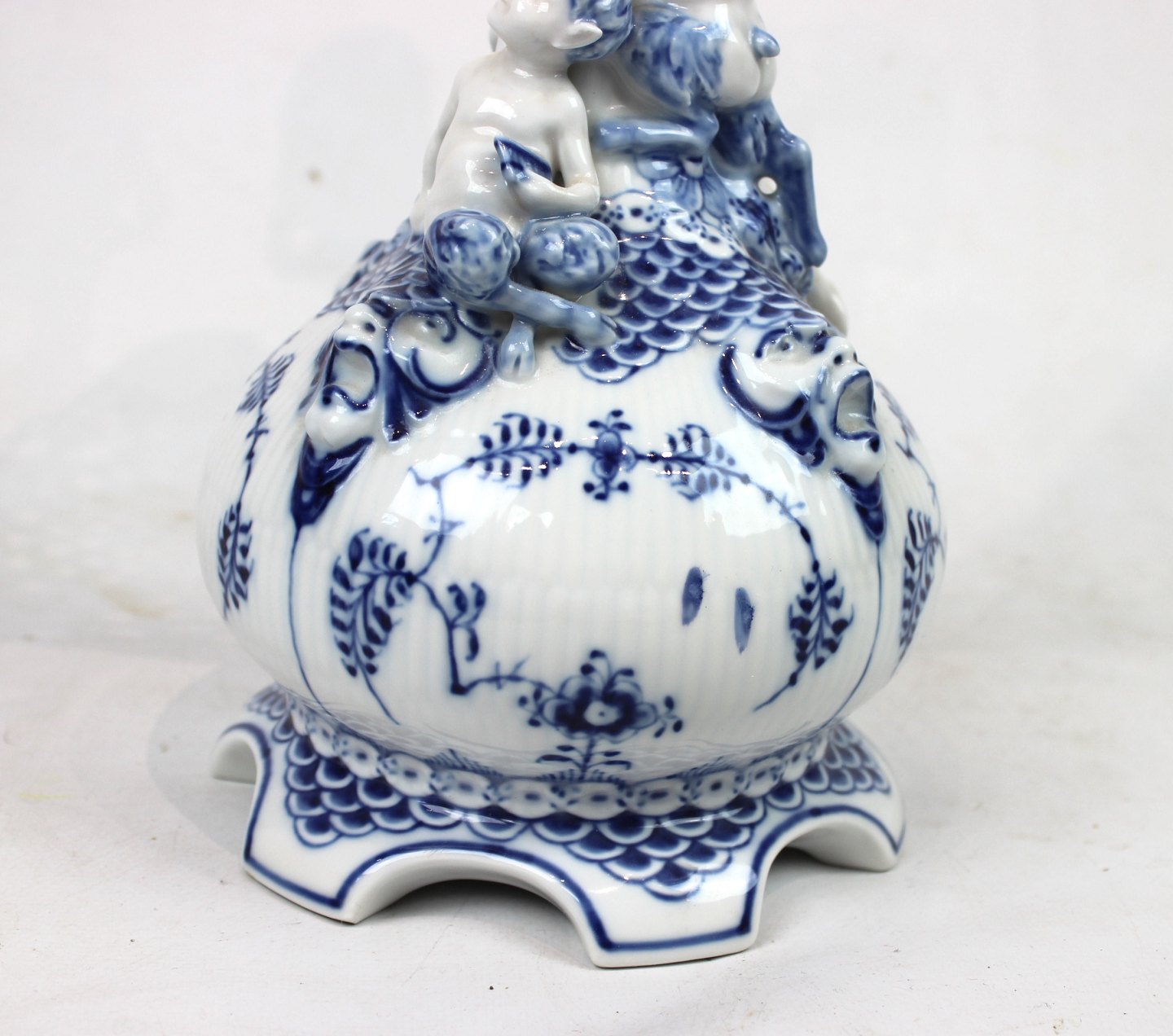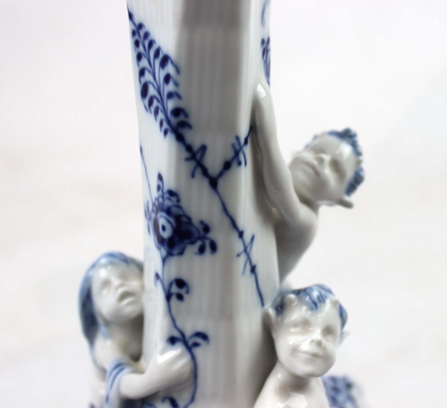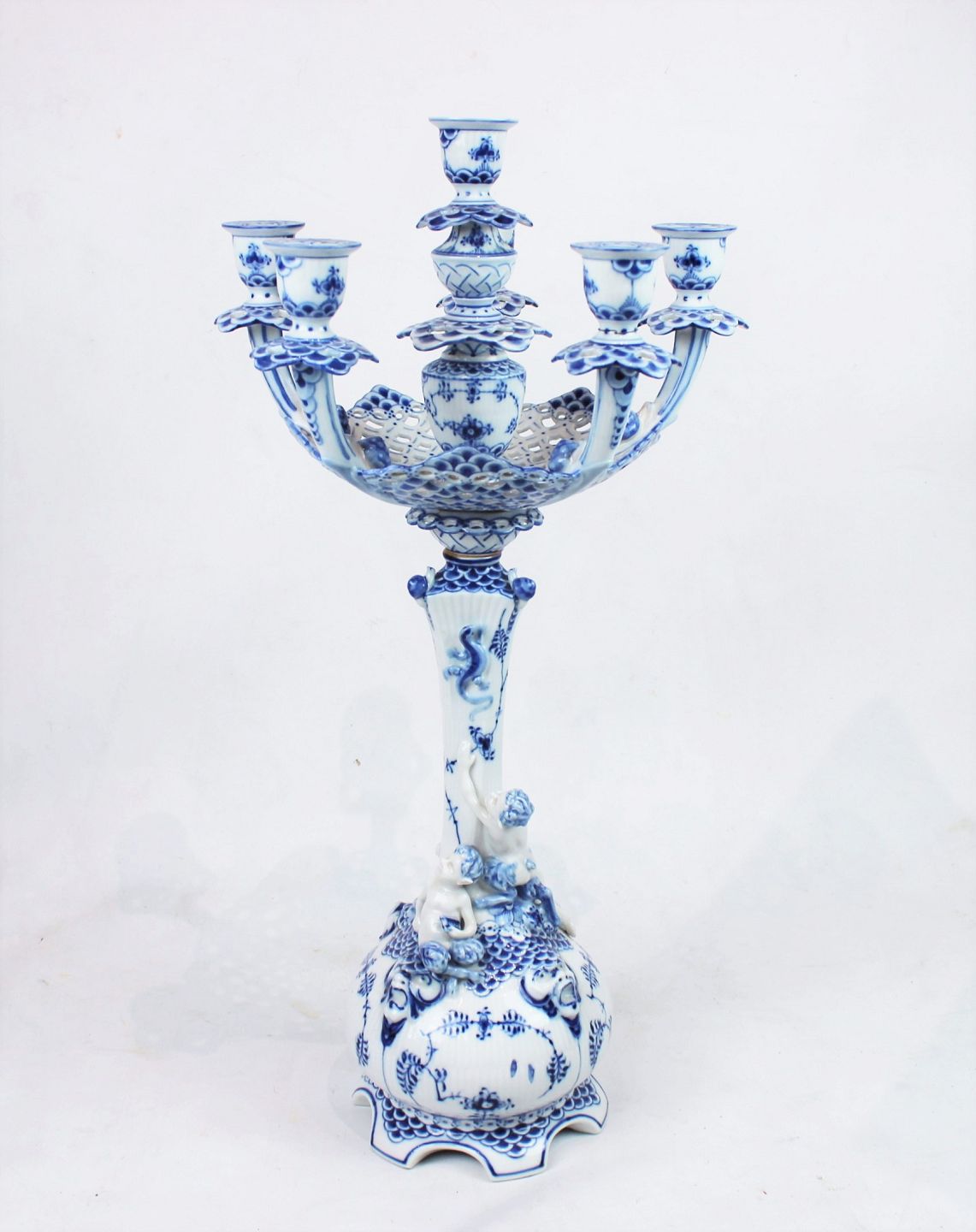 This five-armed candelabra, from Kgl. The Musselmalet Helblonde series is a unique example of Danish porcelain art. The candelabra is beautifully decorated with detailed figures and the classic mussel painted pattern, which has been a cornerstone of Royal Copenhagen's range since 1775.