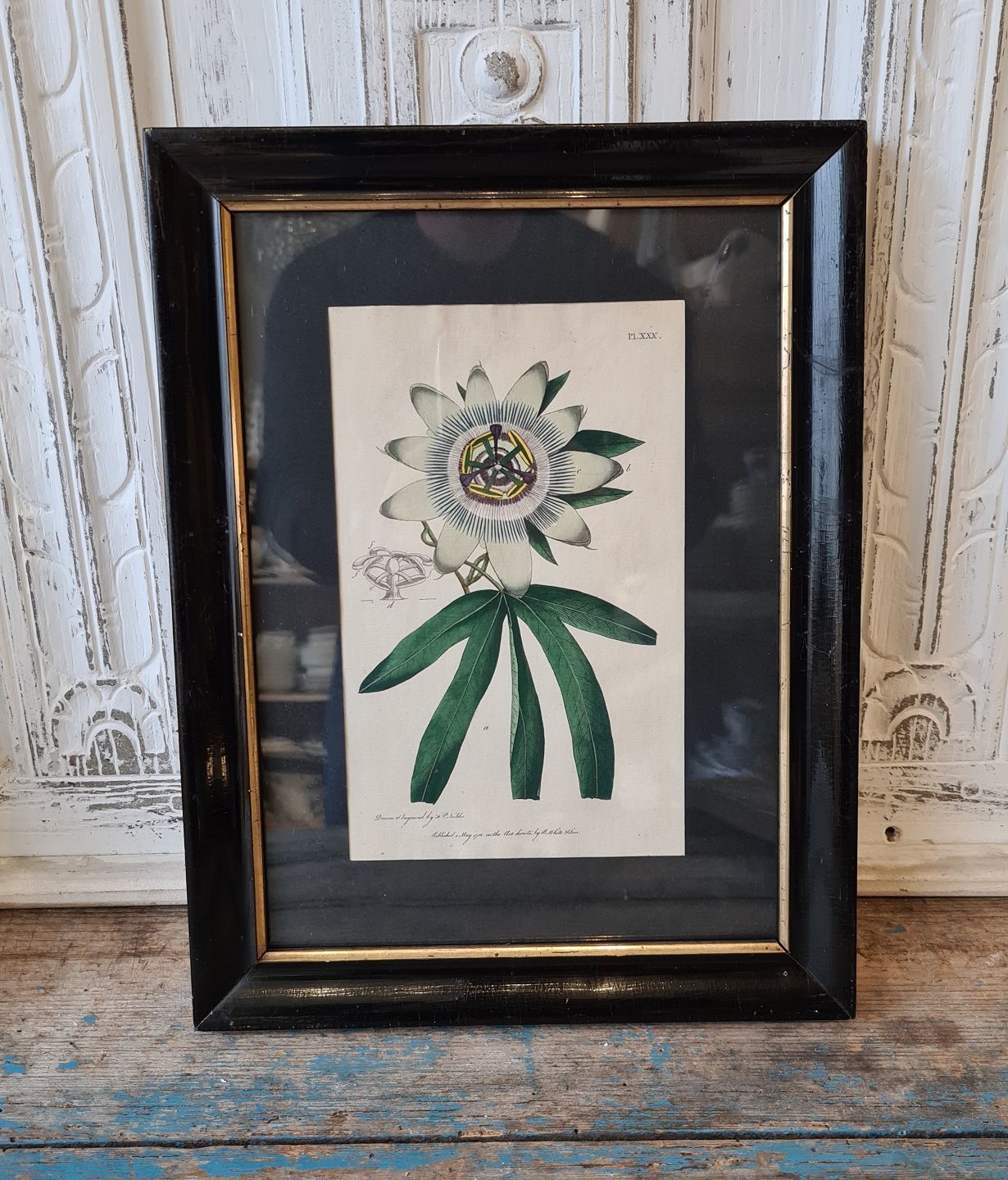 1800s hand-colored botanical print with passion flower in beautiful old black frame with narrow silver border.
