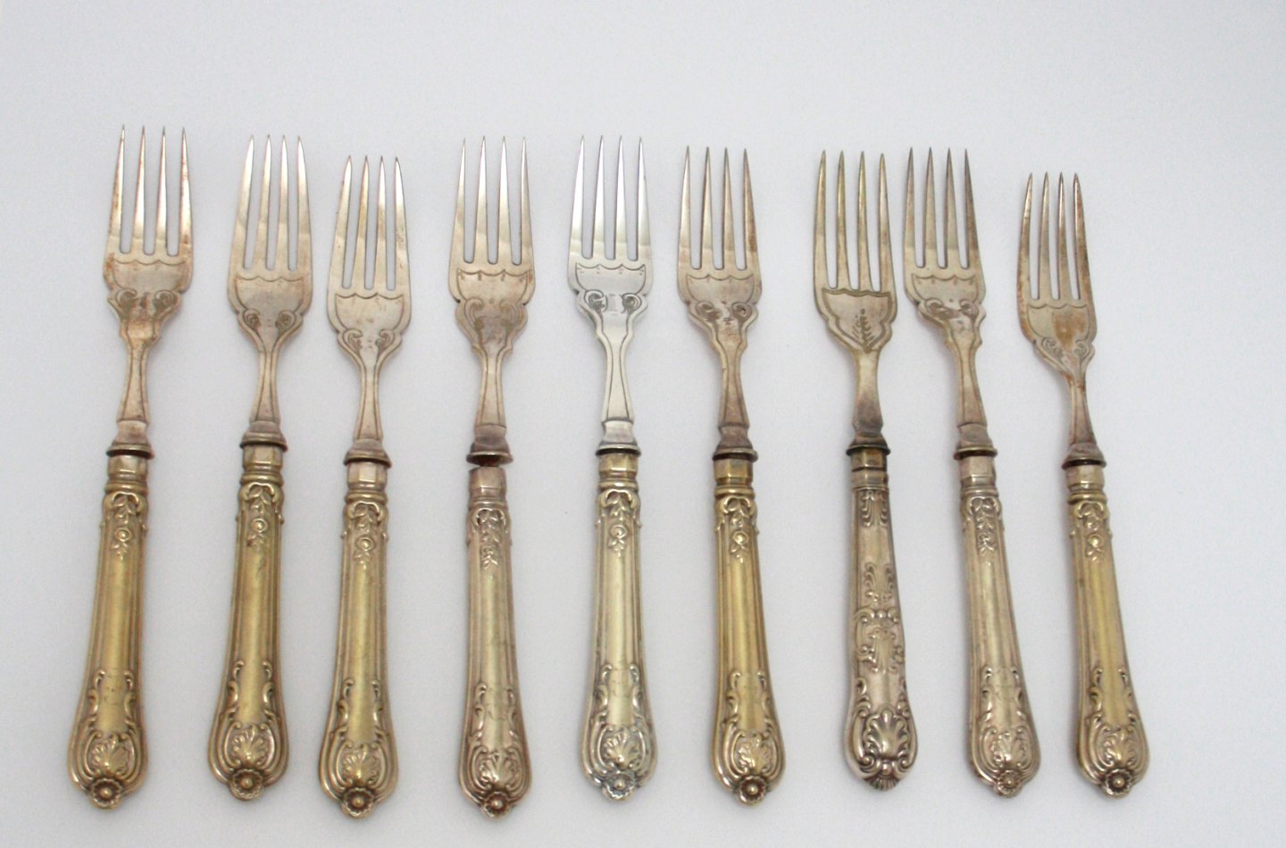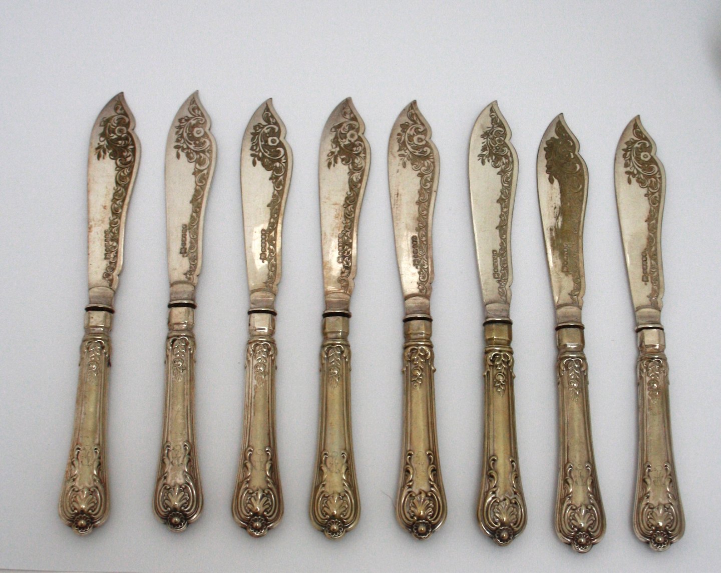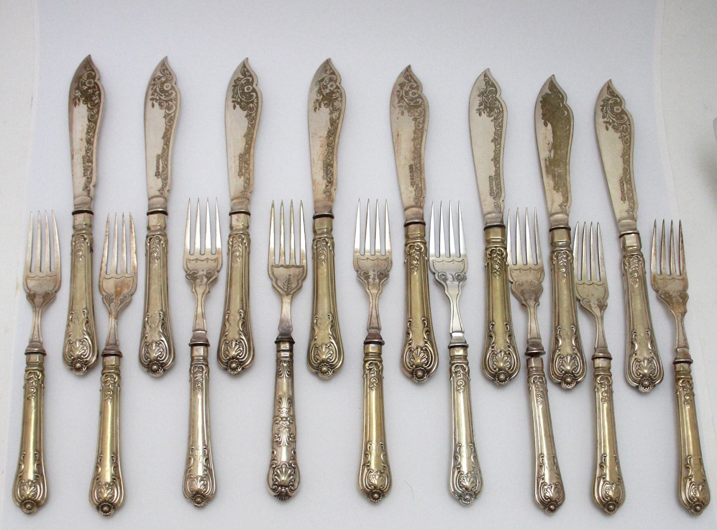 Tysk sølvplet EPNS fiskebestik med brugsslid. Samlet pris: 975 kr.