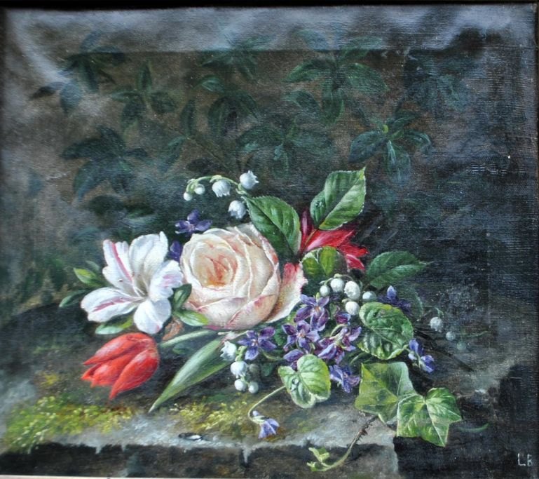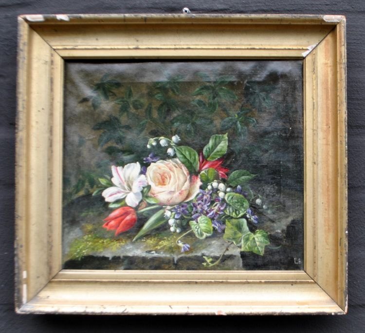 Danish artist (19th century): Arrangement with flowers on a stone. Oil on canvas. Signed: LB. 24 x 28 cm.