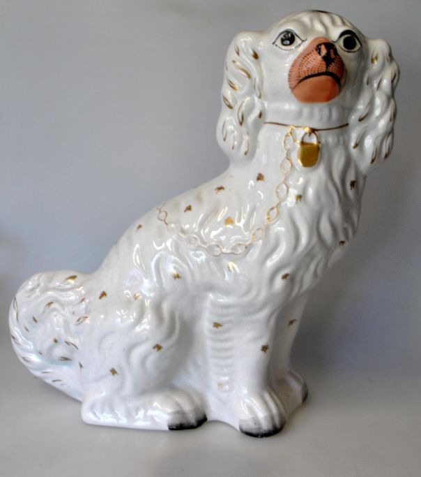 Stor Staffordshire hunde fajancefigur, ca. 1840, England. Med bemaling og forgyldning. H.: 33 cm. B.: 31 cm. Perfekt stand!