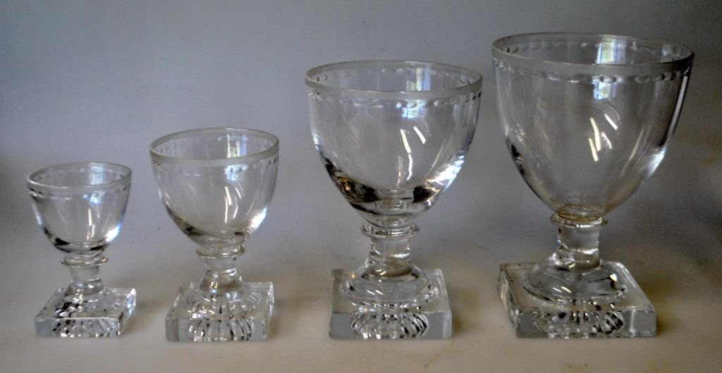 Glas service, Gorm den Gamle, 20. årh. Med firkantet fod og glat kumme med kantslibninger. Bund med runde kronblade. Kæmpe samling.