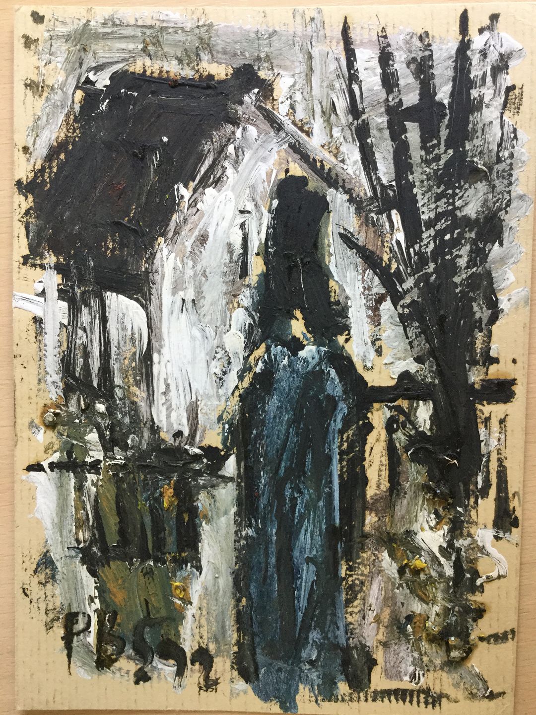 Pastel af Peder Brøndum Sørensen - Personer på kirkegård 1972.