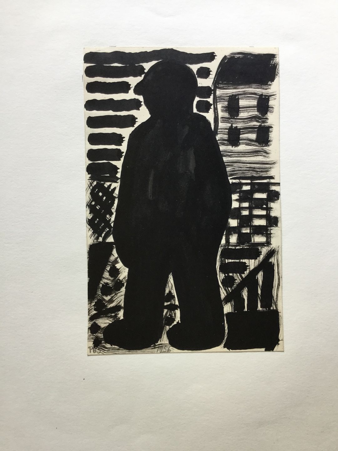 Tegning af Peder Brøndum Sørensen - Person ved hus 1956