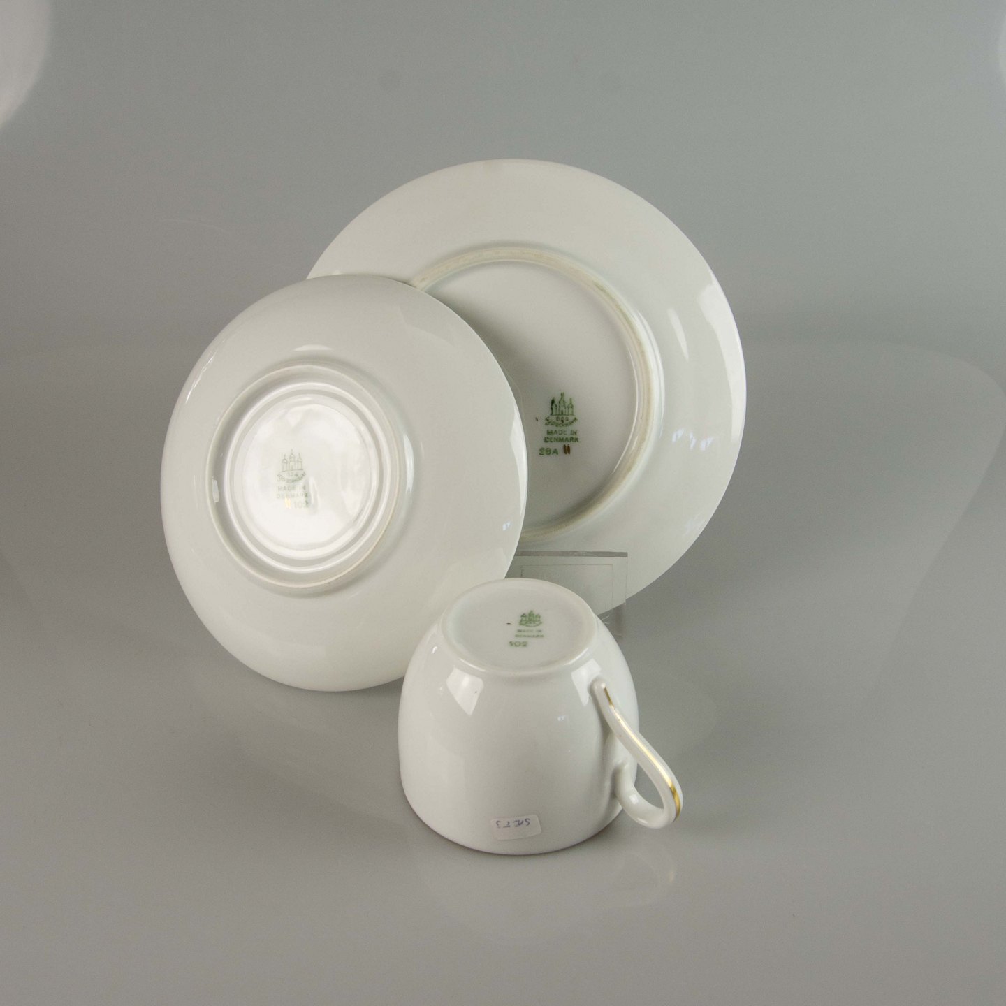 Sæt i hvidt porcelæn med lysegrøn bord og guldkant.