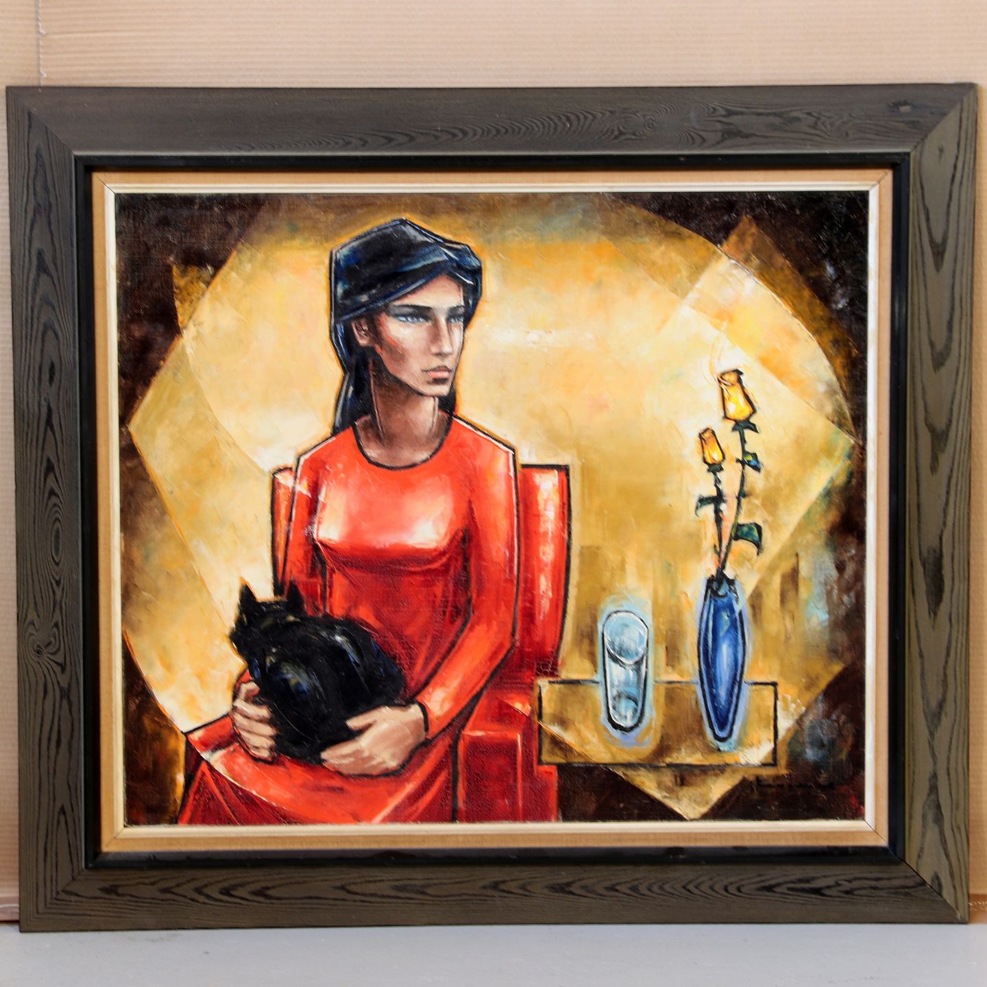 Kvinde med kat, olie på lærred i ramme af egetræ, (HxB 78x89 cm), signeret