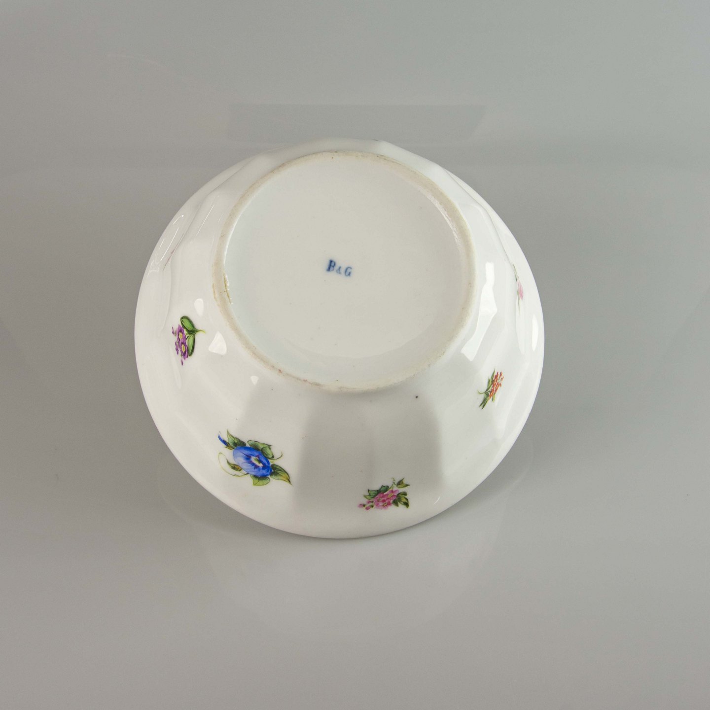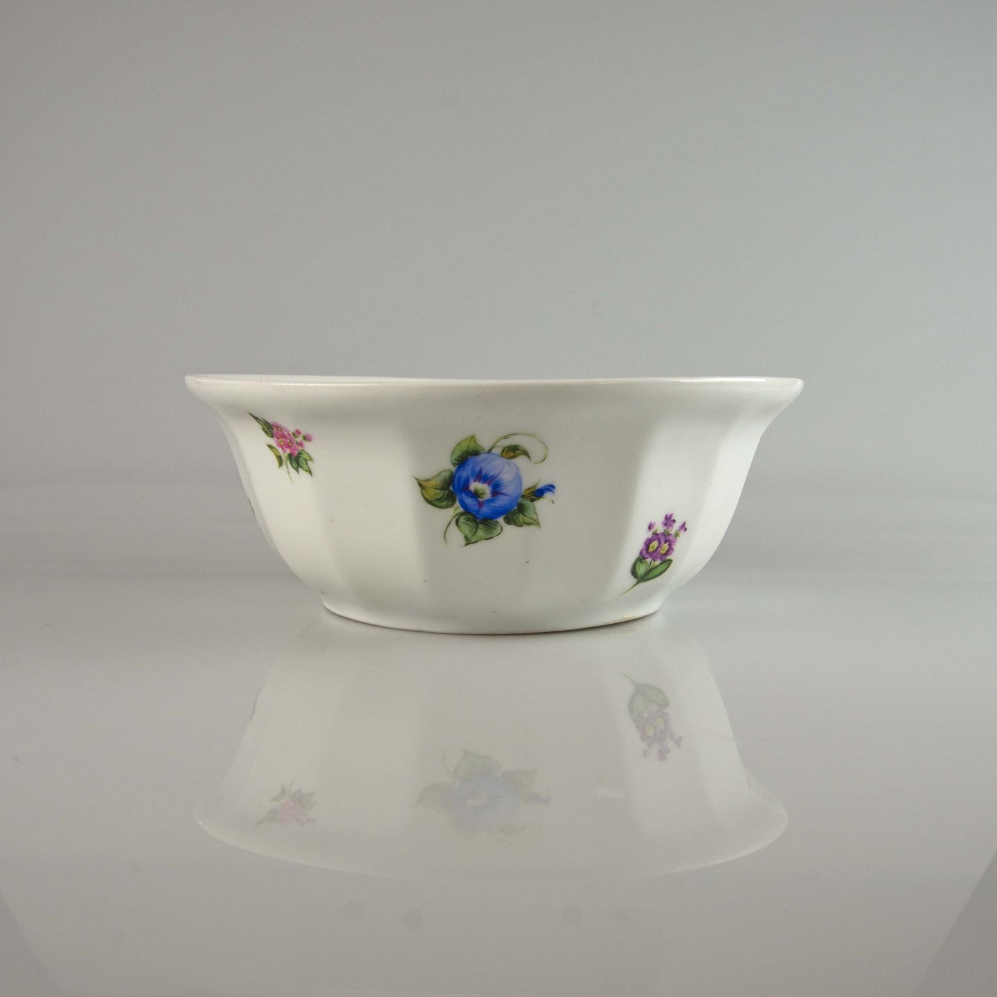 Antik kantet skål i porcelæn med forskellige blomster motiver.