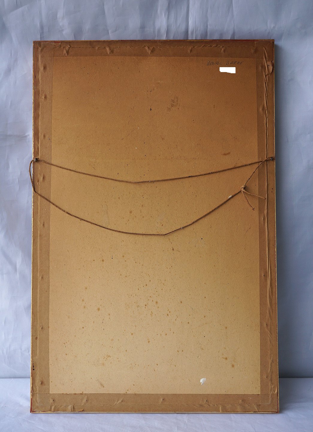 Indrammet træsnit i guldmalet træramme med motiv af Rodet atelier 1962