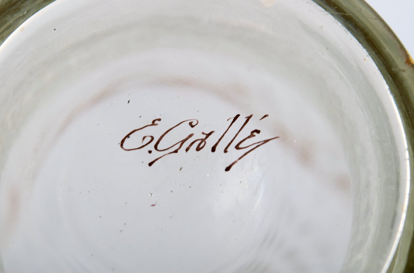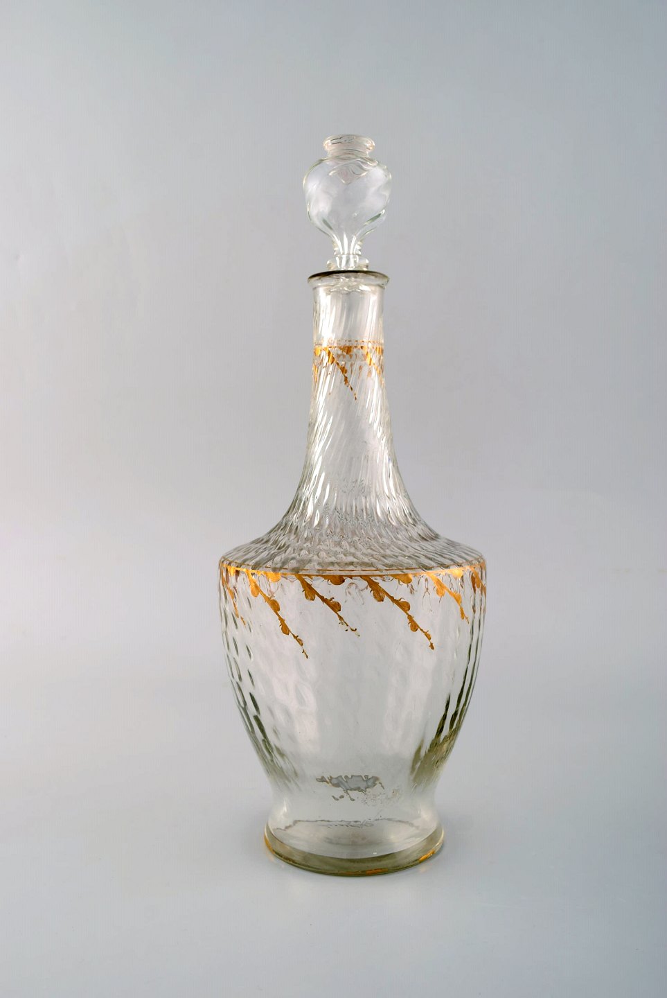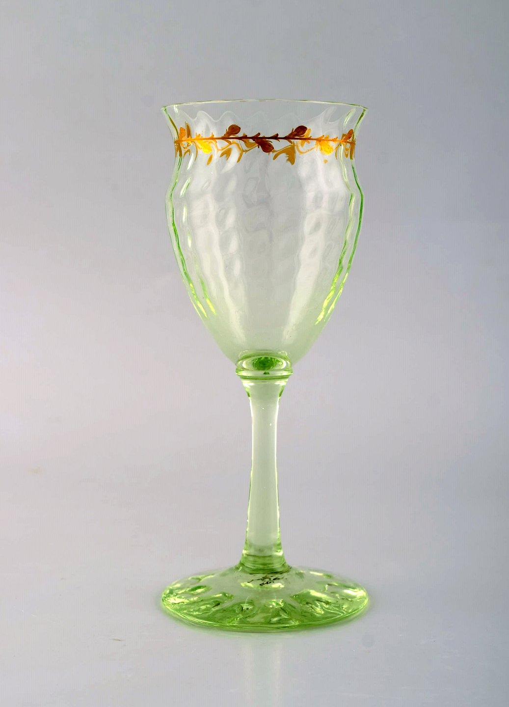 Emile Gallé (1846-1904). Six early and rare wine glasses and carafe in mouth-blown light green art glass with hand-painted gold decorations in the form of leaves. Museum quality, 1870s / 80s.