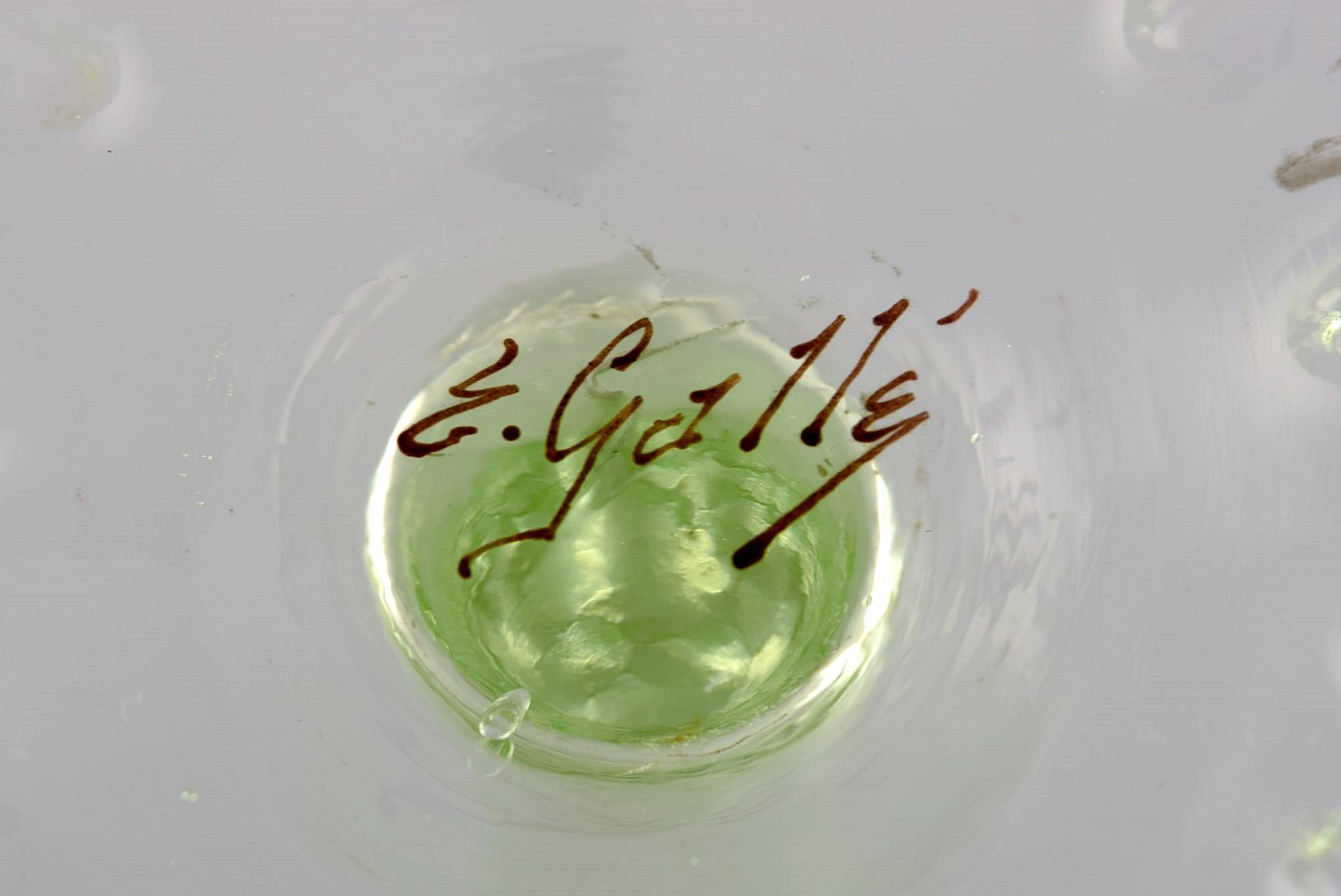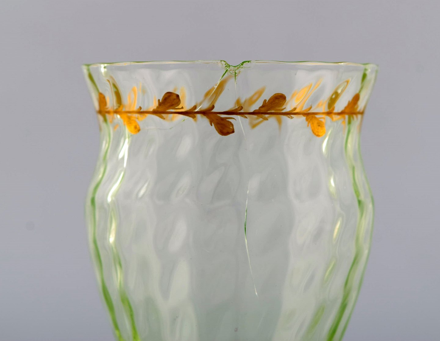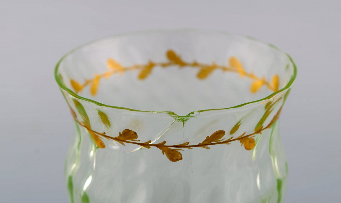 Emile Gallé (1846-1904). Tidligt og sjældent vinglas i mundblæst lysegrønt kunstglas med håndmalede guldekorationer i form af blade. Museumskvalitet, 1870/80'erne.