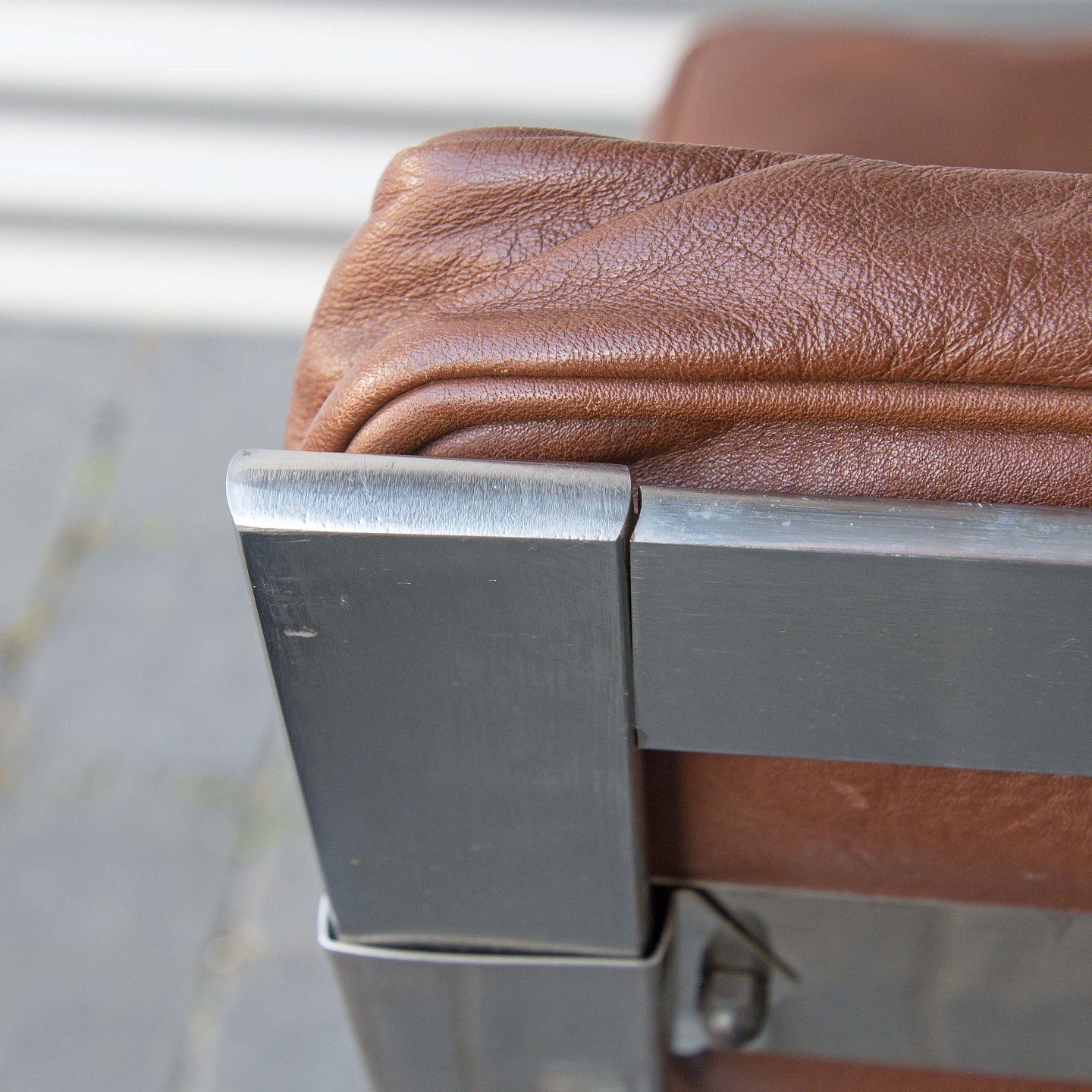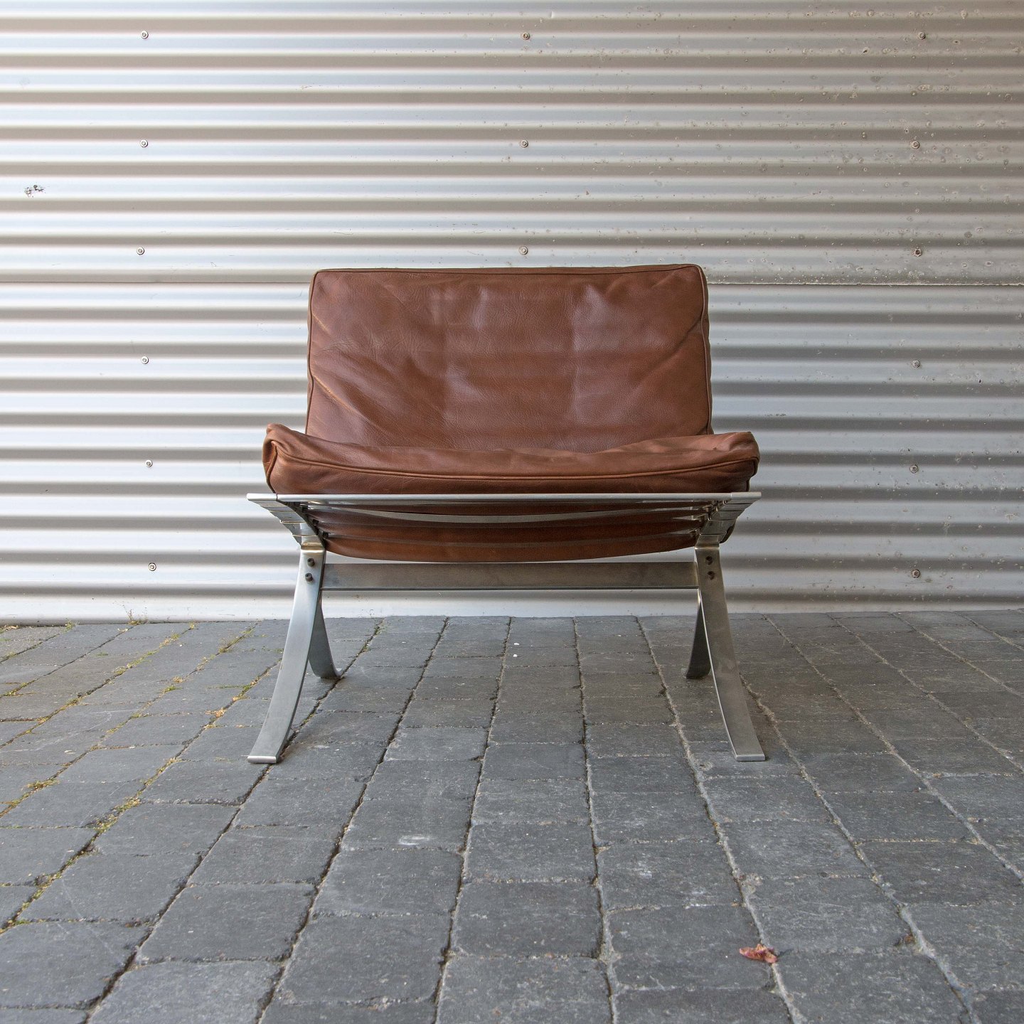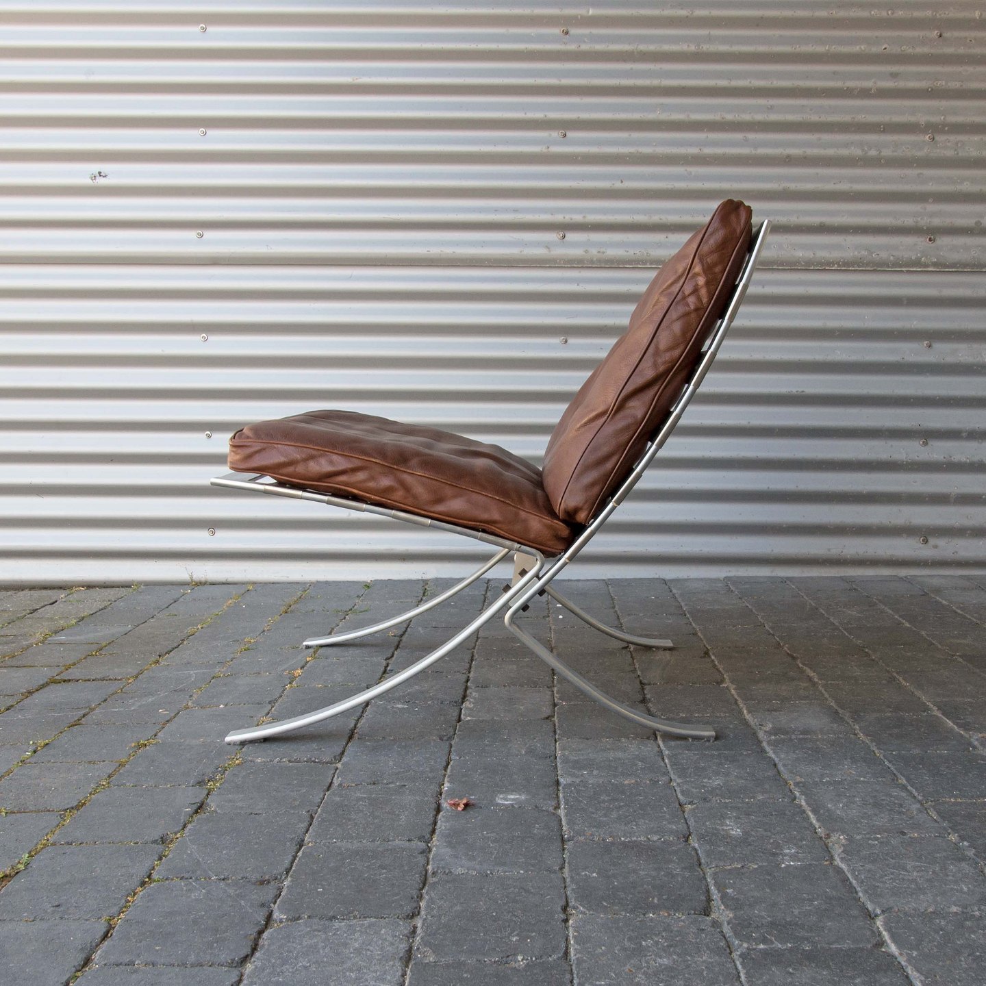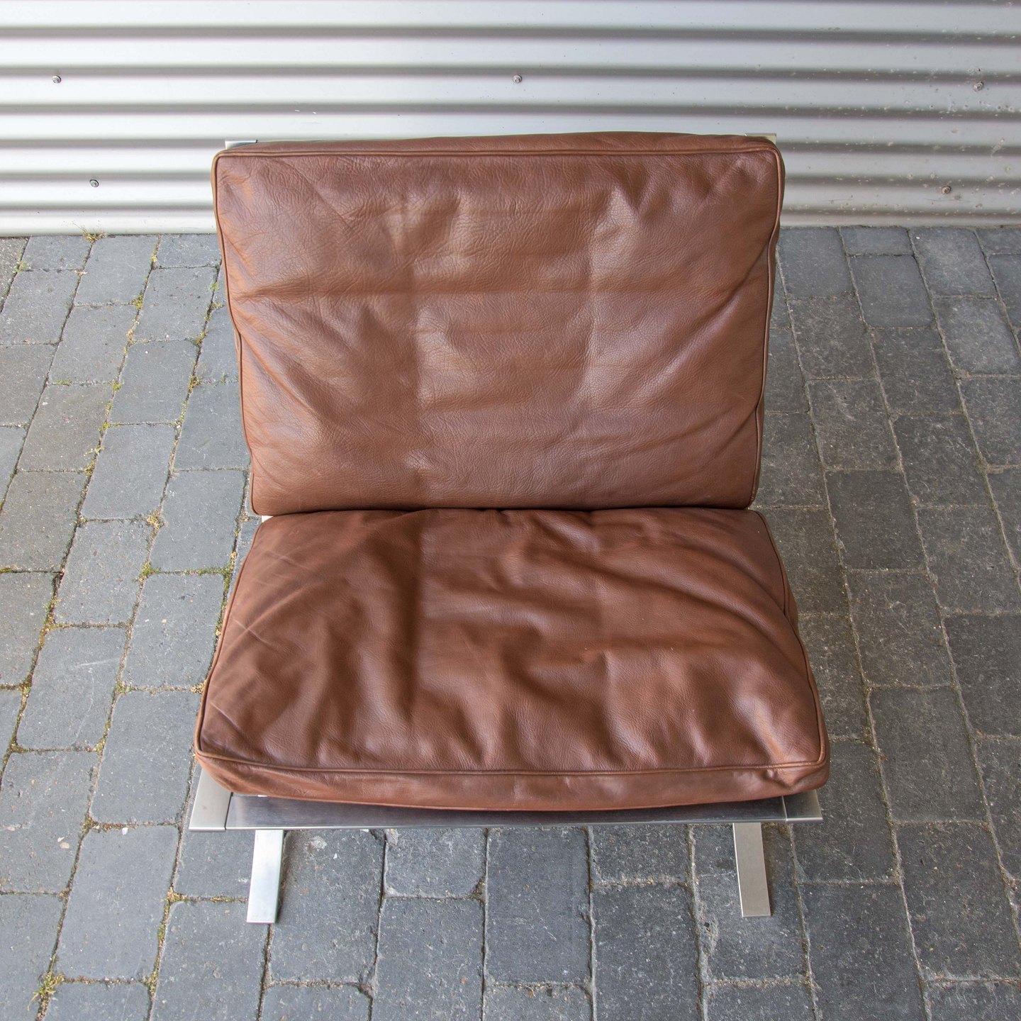 Et sæt loungestole med stel i stål og brune læderhynder