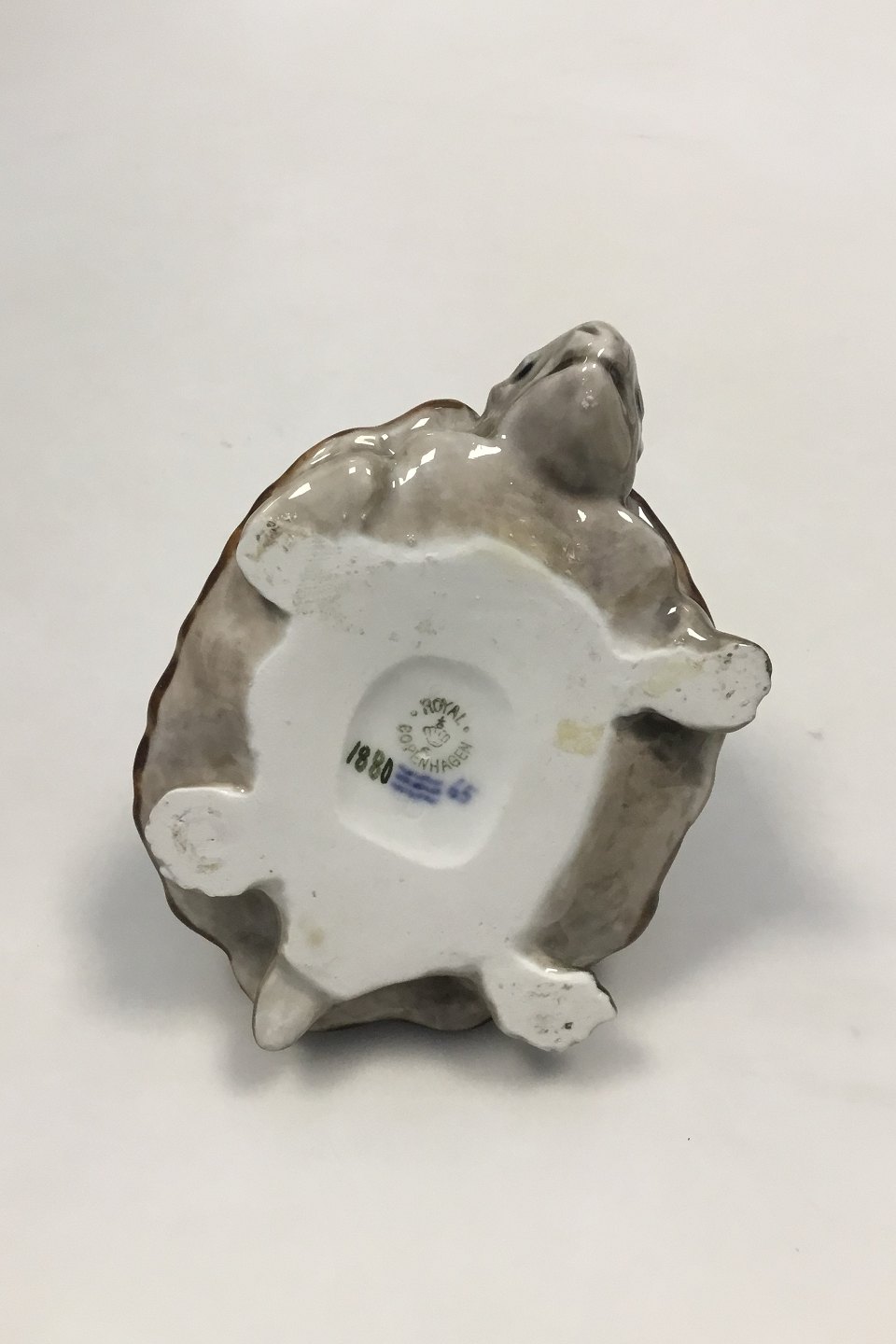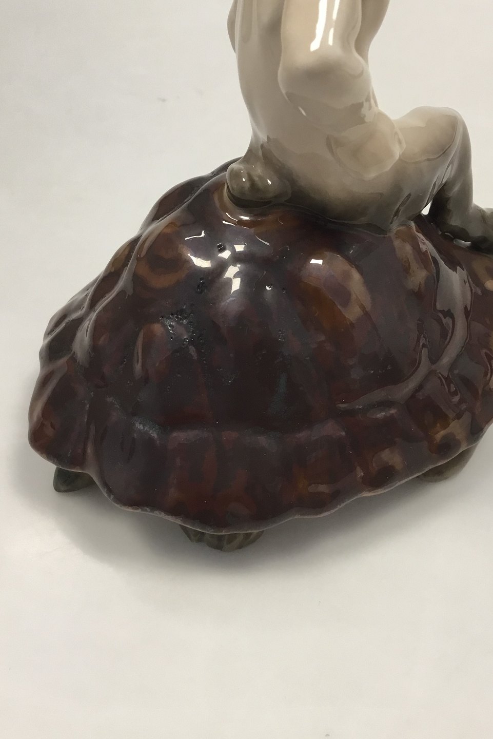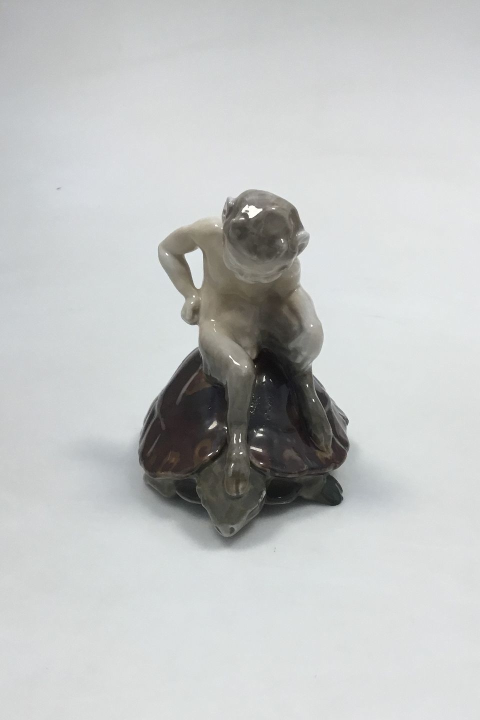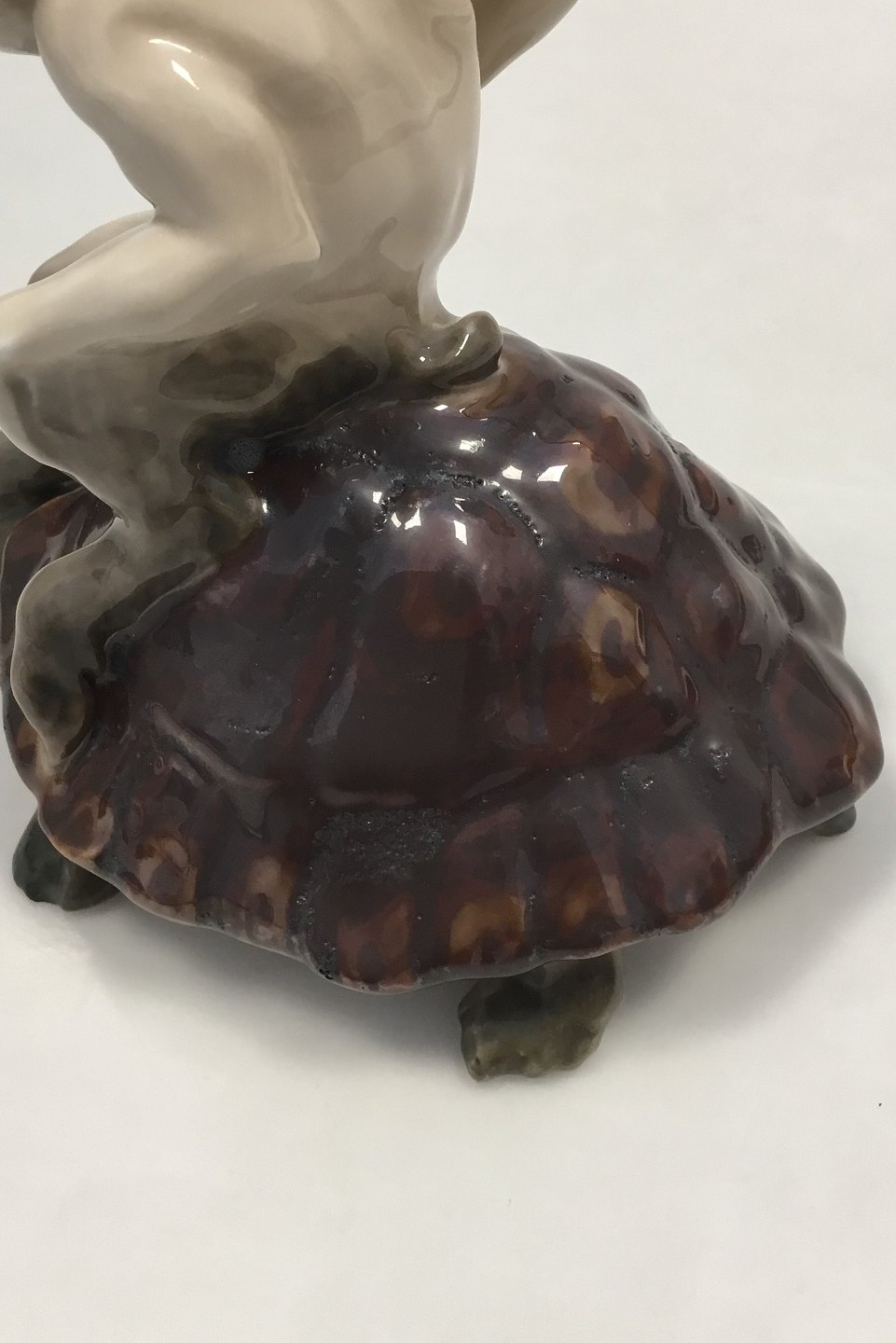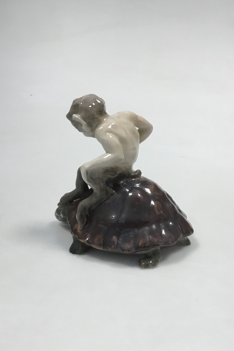 Royal Copenhagen Figurine of faun sitting on a turtle No 1880. Measures 13 cm / 5 1/8 in. The glaze on the turtle's shield has burning defects