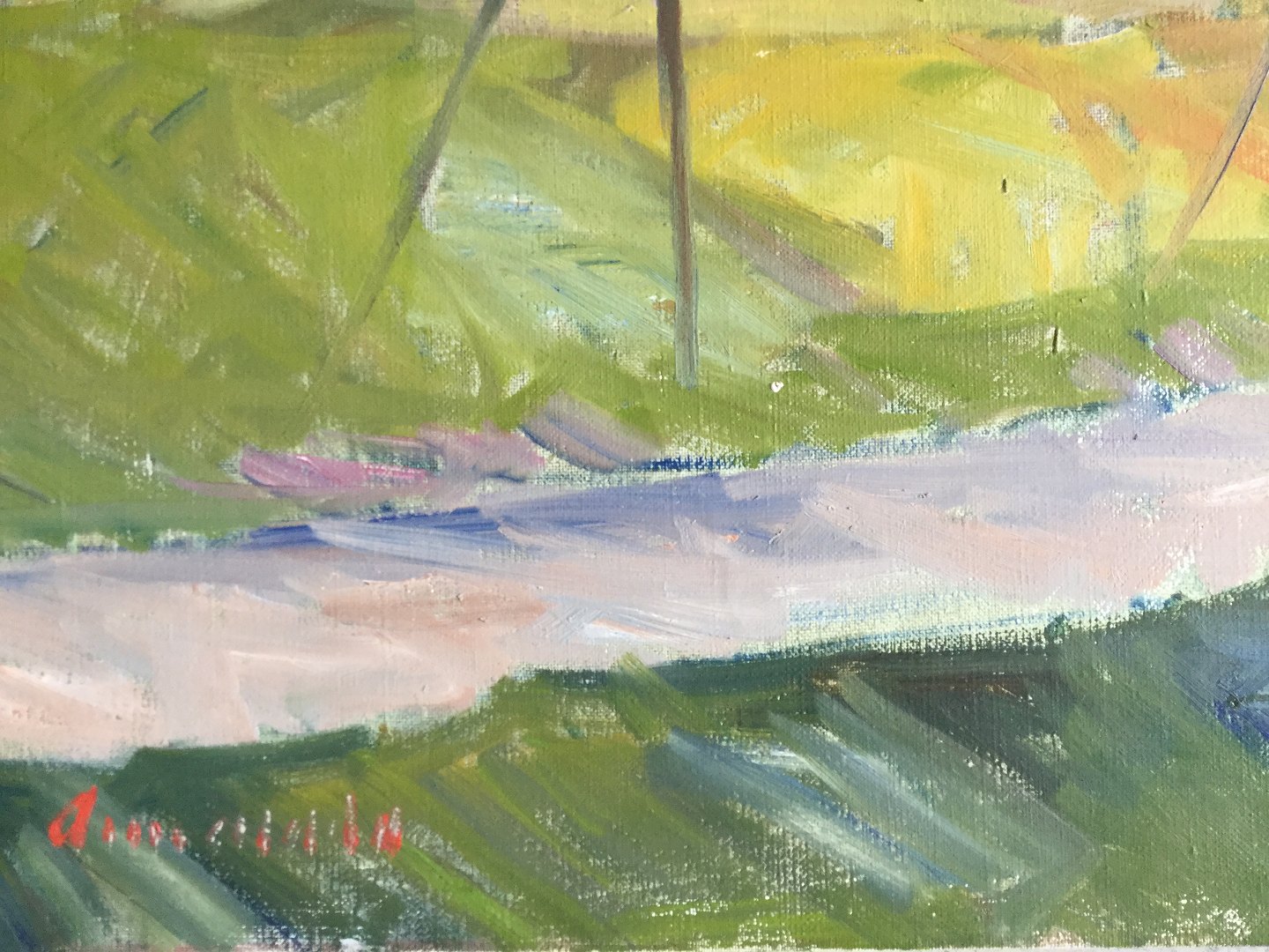 Maleri af Arnold W. Pedersen - Landskab med kirke.